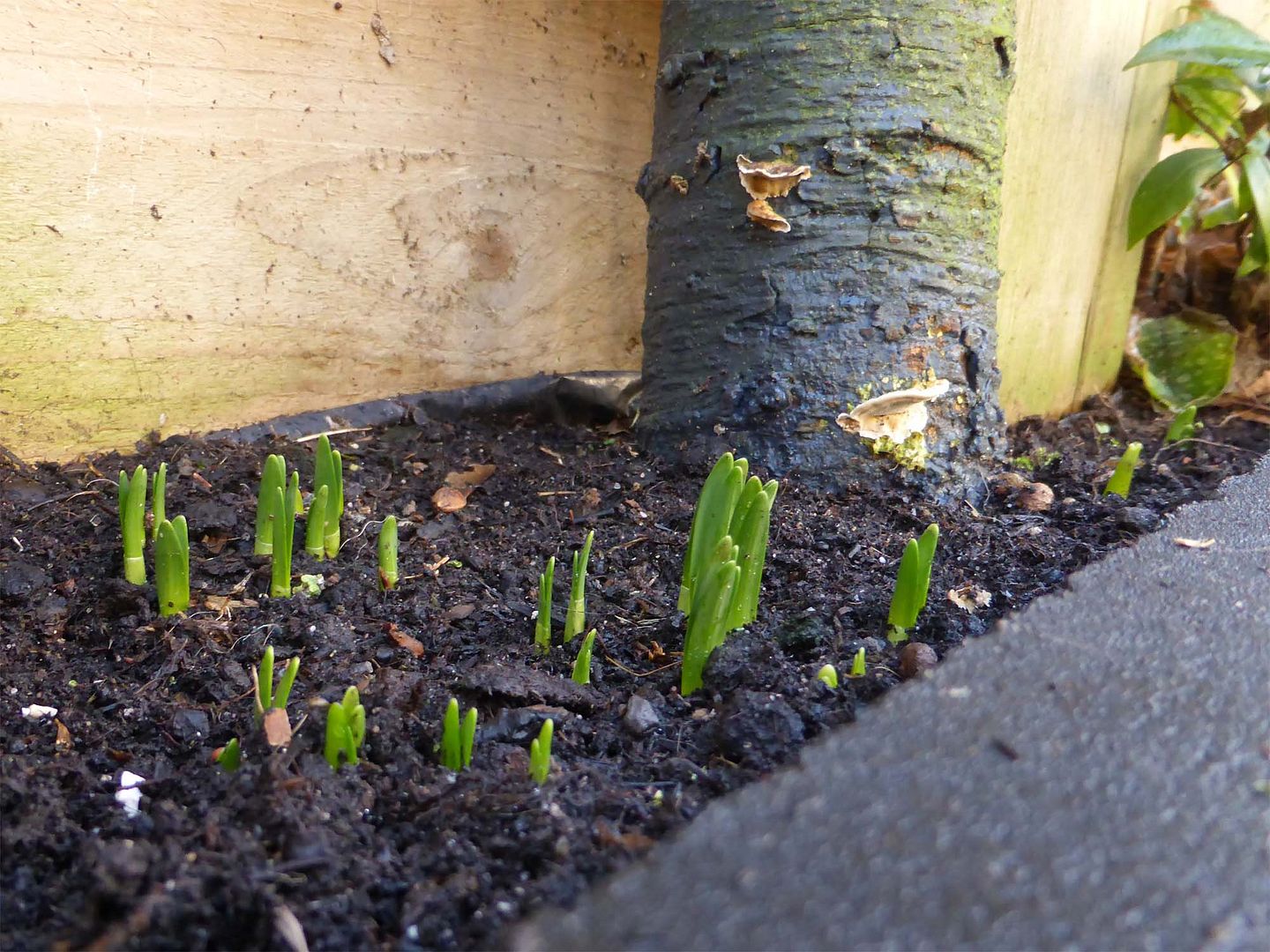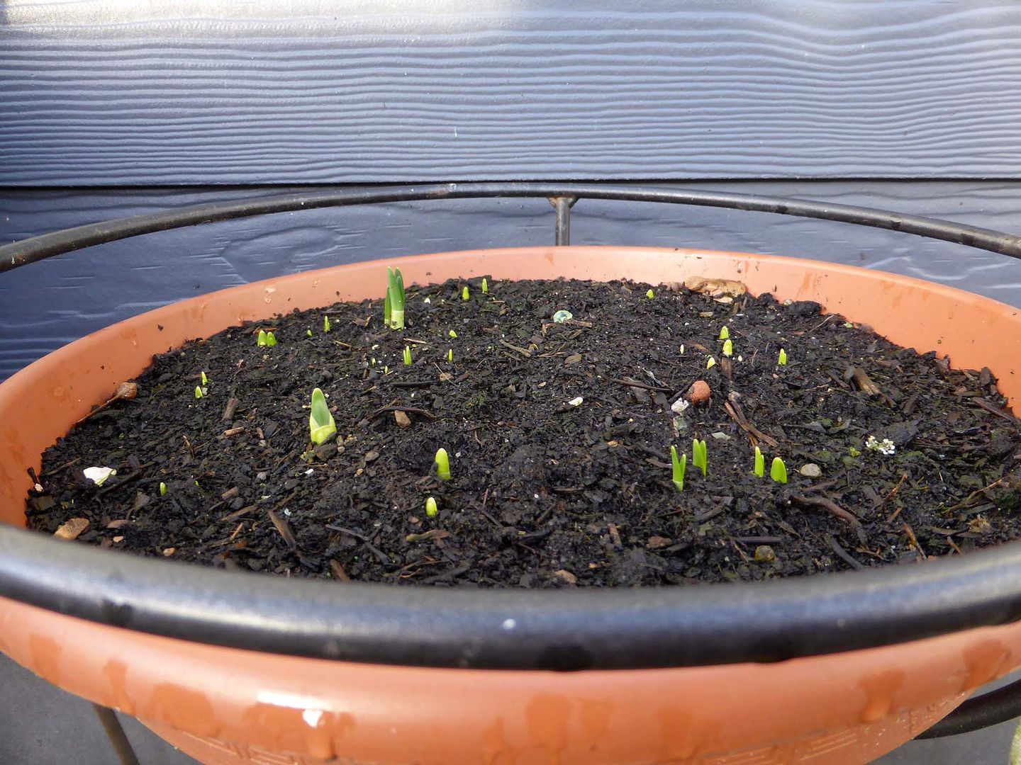 In mijn bollenbak is van alles aan de hand, het wemelt van de groene puntjes. Spannend!