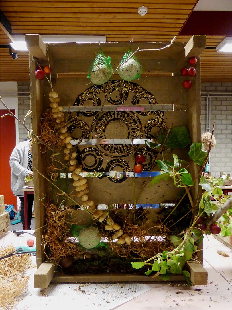 Eerst een Zeeuwse knoop erin, daar wat zaad op en dan maar verder opsieren met wat er voorhanden is. Vetbolletjes, zaadjes, pinda's, takjes, kortom het ziet er leuk uit.