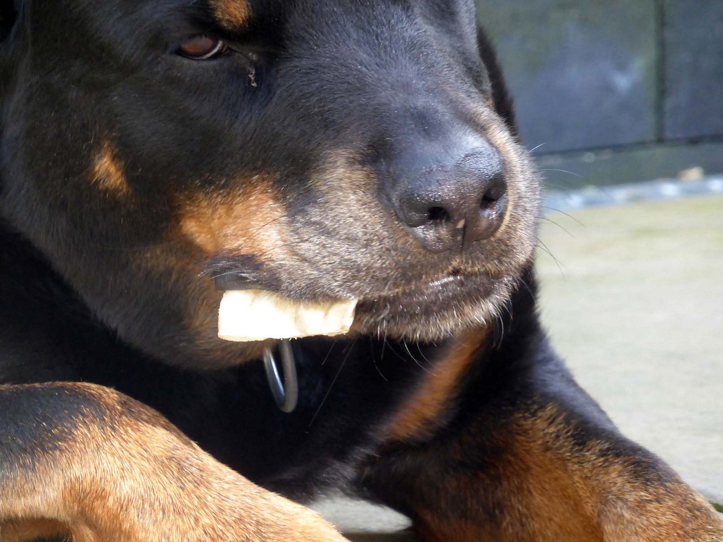 Gisteren kocht ik dikke grote stokken om op te kauwen om de spier weer te stimuleren, maar daar bleef ze maar mee zeulen en weinig kauwen, tot vanmorgen toen ze hem mee naar buiten nam en netjes in 'mijn tuin' begroef. Dat deed ze op Scharendijke ook altijd dan worden ze lekker zacht, maar dat is niet de bedoeling natuurlijk. Vervelend is wel dat ik nu nergens die stok meer kan vinden, zo groot is die tuin toch niet en ik zie precies waar ze gegraven heeft.
