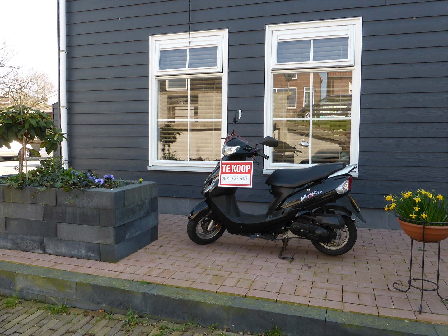 We hebben een mooie stoep om dingen te koop te zetten, dat doen we om te beginnen maar eens met de door Joop opgeknapte brommer met het spiksplinternieuwe motorblok.