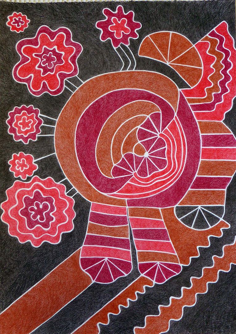 Hier ook nog maar even spammen met mijn nieuwe tekening. Ik vind hem zelf erg leuk, maar ik denk dat anderen een 'gewone' boom met bloemetjes of een poes leuker vinden. Deze maakte ik weer met mijn 'oude' potloden, de pablo's van Caran 'd Ache, zodoende verdiep ik me daar ook steeds meer in. Wat me nu bij deze opviel was dat ze behoorlijk afgeven ook al zijn ze wat harder, dat kan ook door de gebruikte kleuren komen maar toch..
