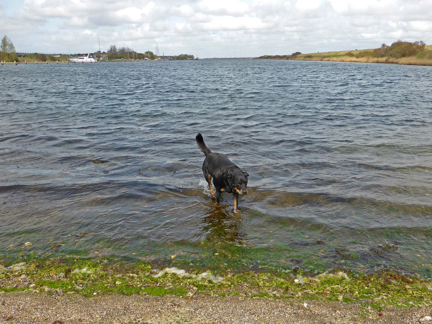 Zo koud als het er op de foto uit ziet was het ook, maar omdat we voor het eerst weer eens aan de andere kant van de dijk keken kon Didi het toch niet laten even haar poten nat te maken, verder niet hoor bbrrrr.