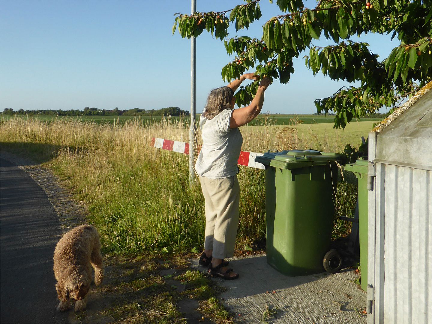 Marlies vindt altijd wel iets eetbaars onderweg, spekkersen, een boom vol, nog net niet rijp, daar komt ze volgende week voor terug.