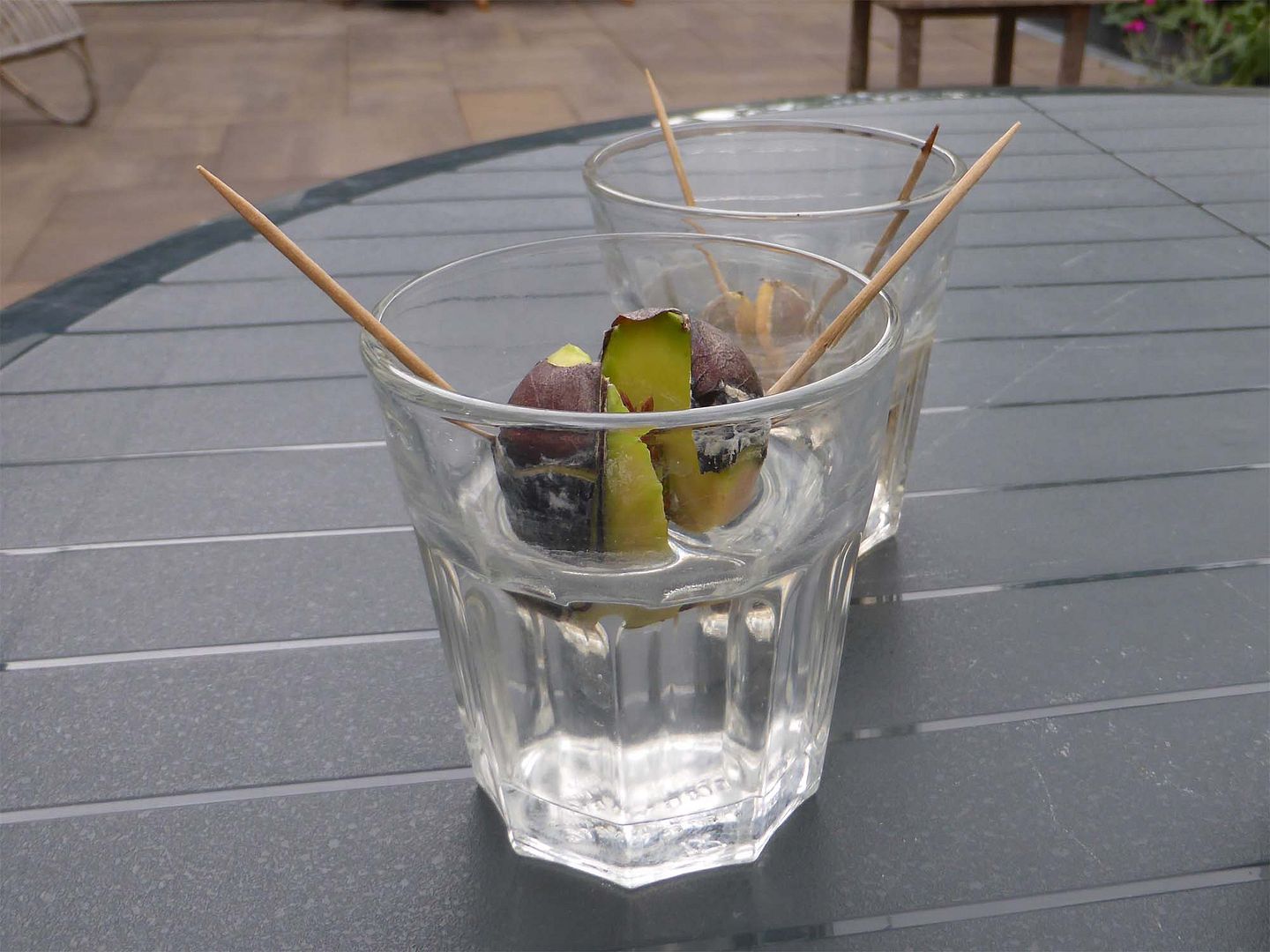 Men neme een paar avocadopitten, prikt die aan een coctailprikker en hangt ze in het water totdat er iets gebeurt.