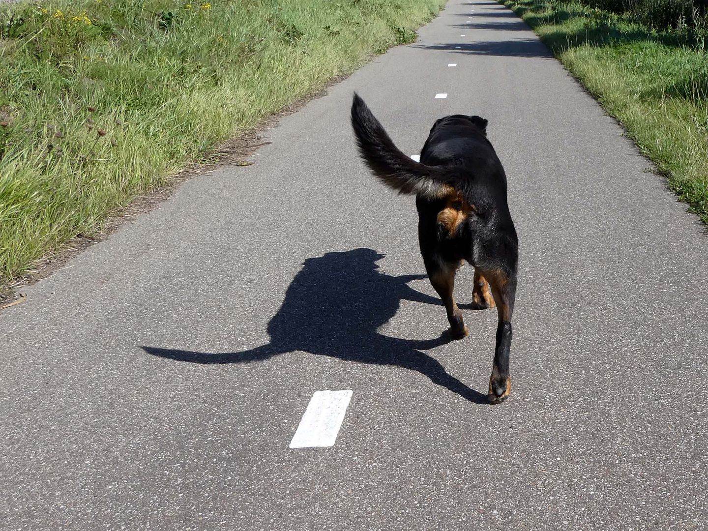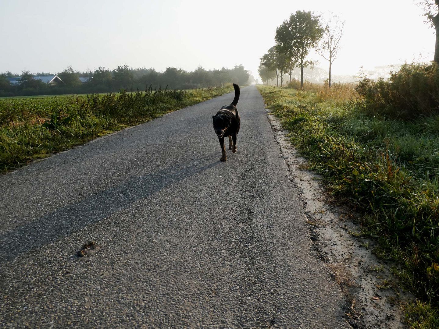 Het was lekker vanmorgen, droog, zon en een koekje onderweg, wat wil een hond nog meer.