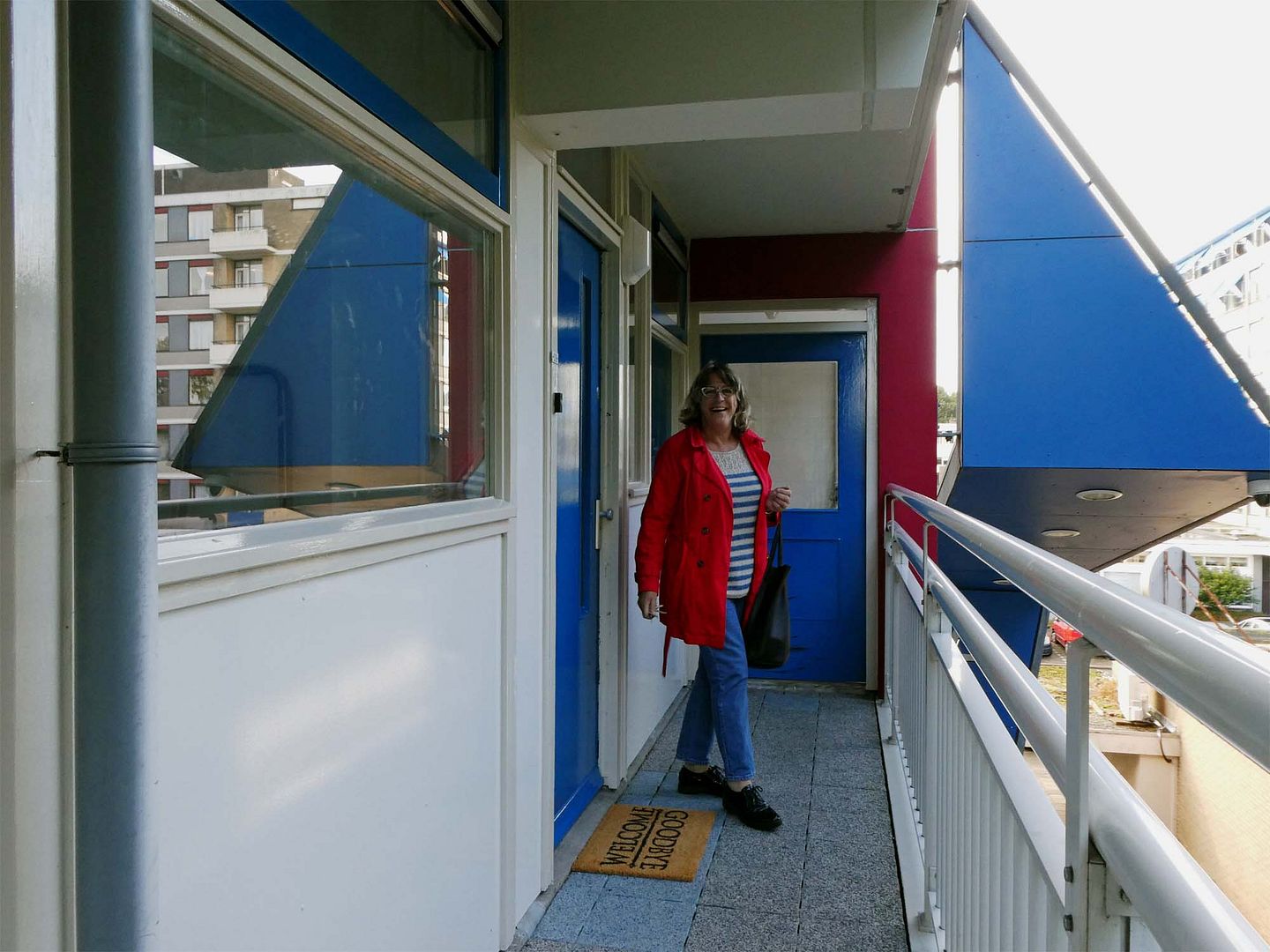 Ze kwam maar niet door die deur dus ik ging maar eens bellen, stond ze achter me te praten, 'ja ik sta hier voor een te koop bord...'