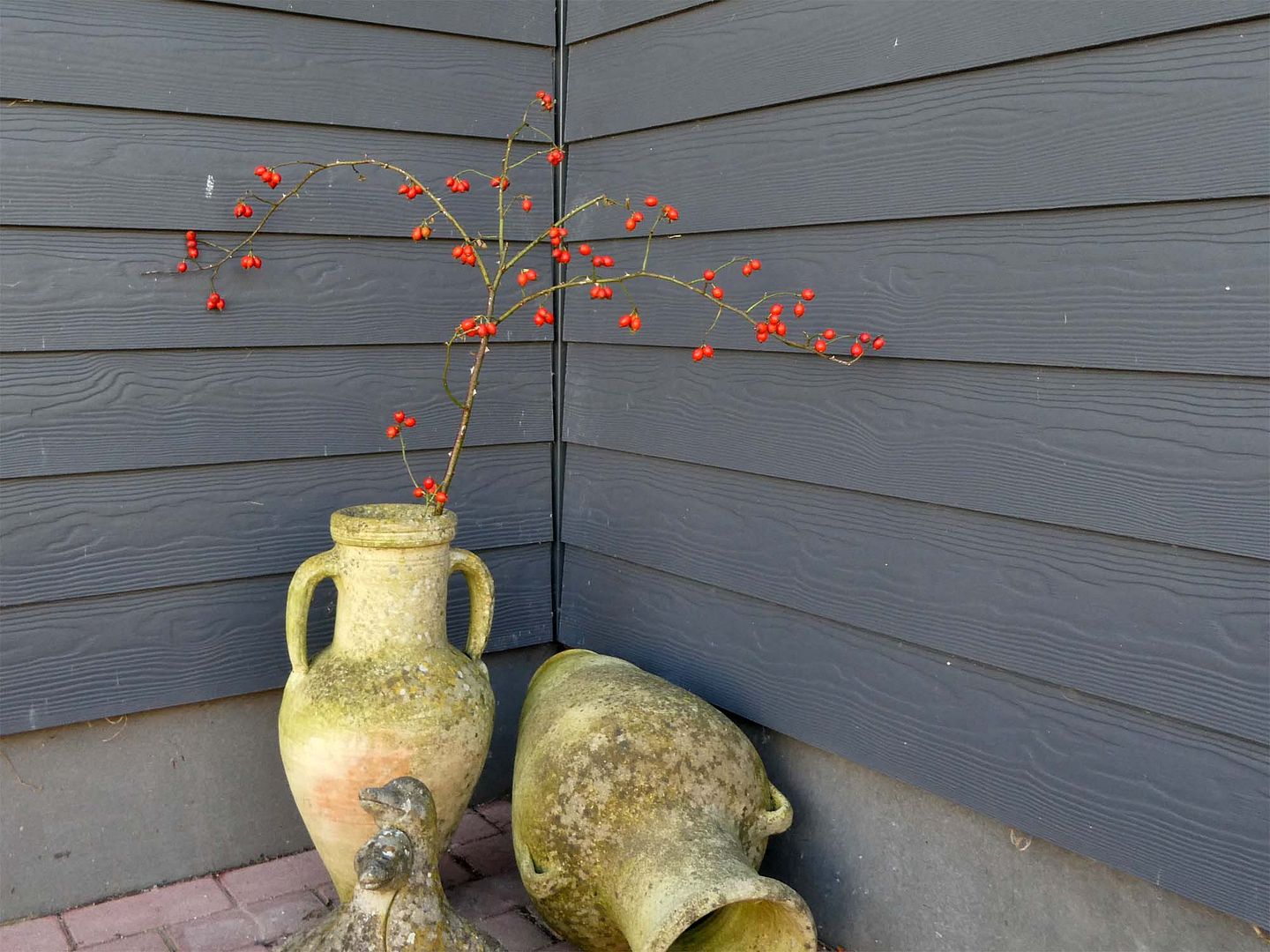 Ik had vorige week van Kees een mooie rozenbotteltak meegekregen en wilde er eigenlijk nog eentje bij, dus mocht je aan het snoeien gaan, denk aan mij, of zet ze anders zelf ergens neer, het staat erg leuk vind ik die oranjerode bolletjes.
