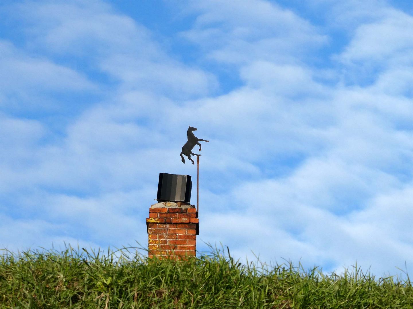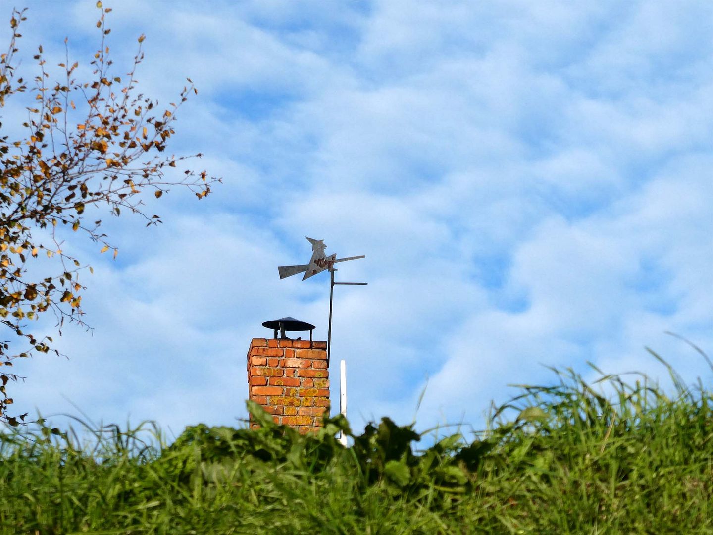 Dat paard is wel een hele simpele windwijzer, als het er al eentje is, de heks is wel leuk. Dat krijg je als je naar de lucht gaat lopen kijken dan zie je ineens weer heel andere dingen dan bloemen, die er nu even niet meer zijn.