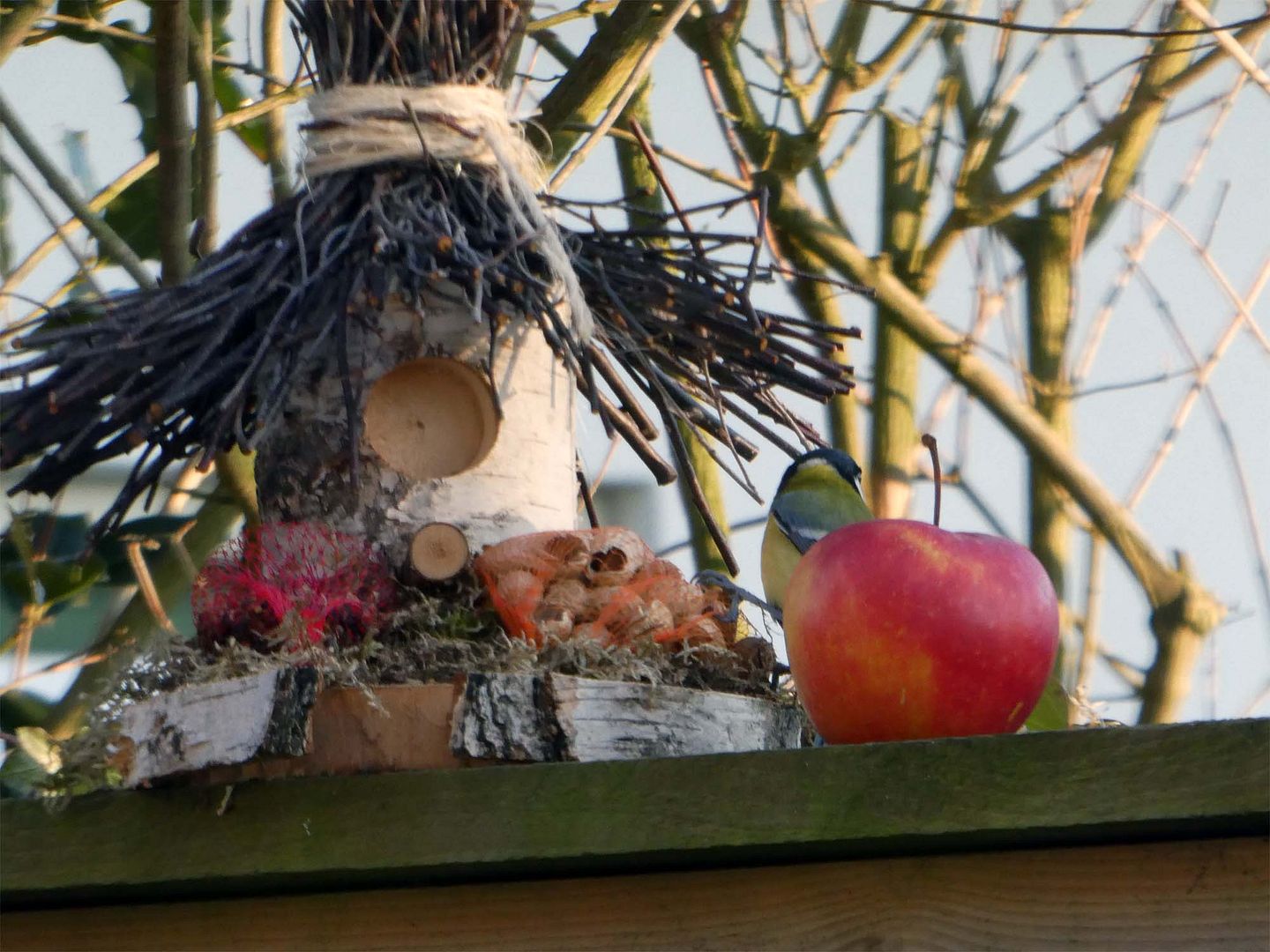 De vogels komen op het snoephuisje af dat ik vorige week kreeg op het duivenfeest en ook al is het best koud, het wordt toch al een beetje voorjaarsachtig als de zon in mijn tuintje schijnt, want die komt echt met de dag iets hoger te staan hoor.
