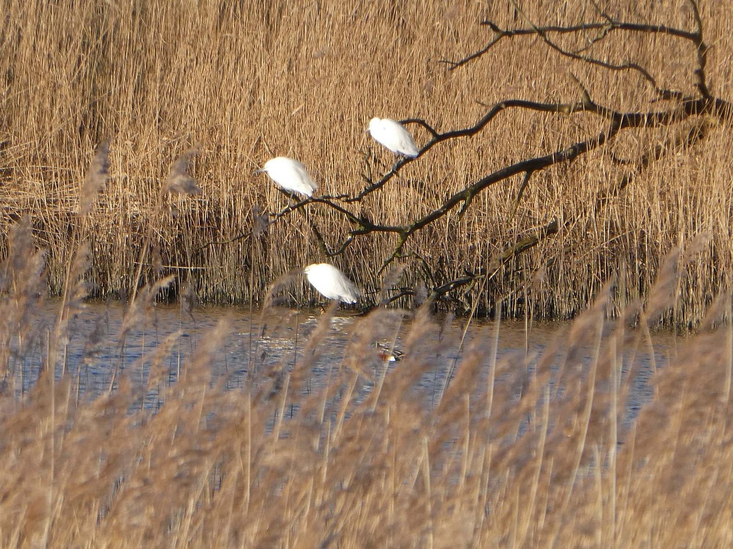 Ze zitten er maar een beetje kouwelijk bij wachtend op een voorbijzwemmend ontbijtje en ze staan ook niet goed op de foto omdat ik teveel moest inzoomen, maar het gaat me in dit geval meer om de kleuren en de witte dodden die met een beetje fantasie een hartje vormen, dat mag toch ook. Het zijn witte reigers.