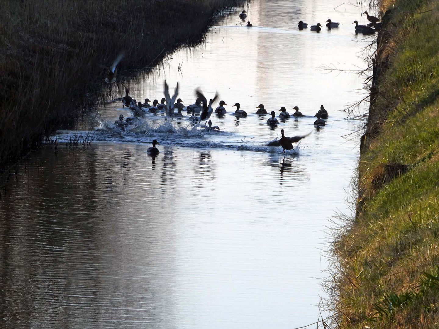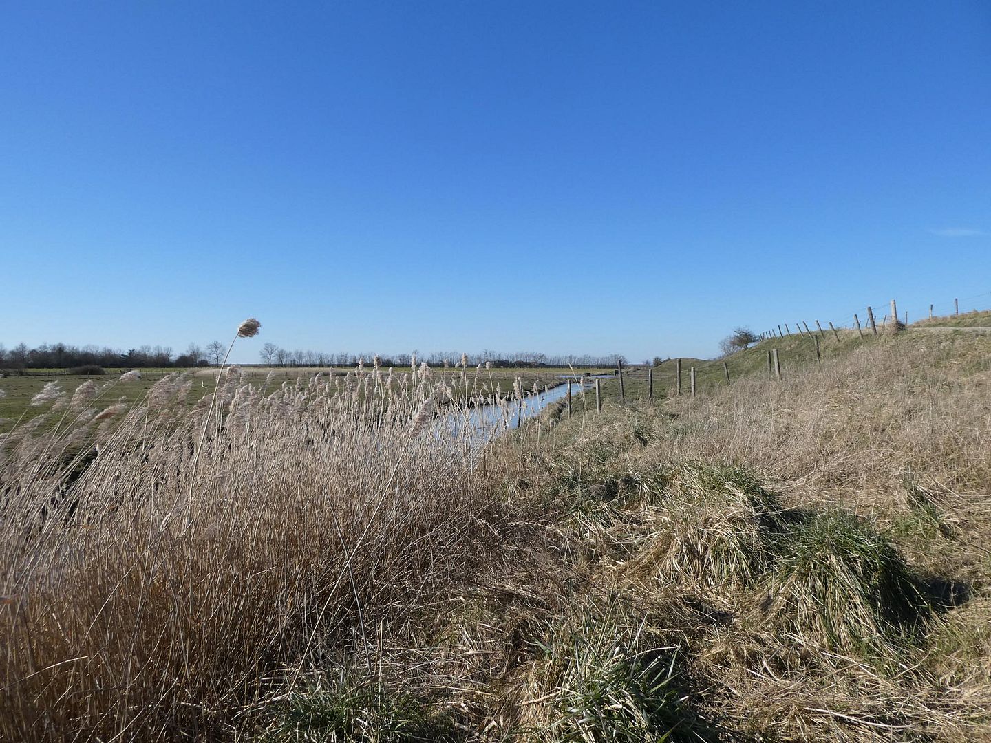 Weinig ijs op de sloten, vriezen doet het nauwelijks, maar de wind maakt het extra koud.