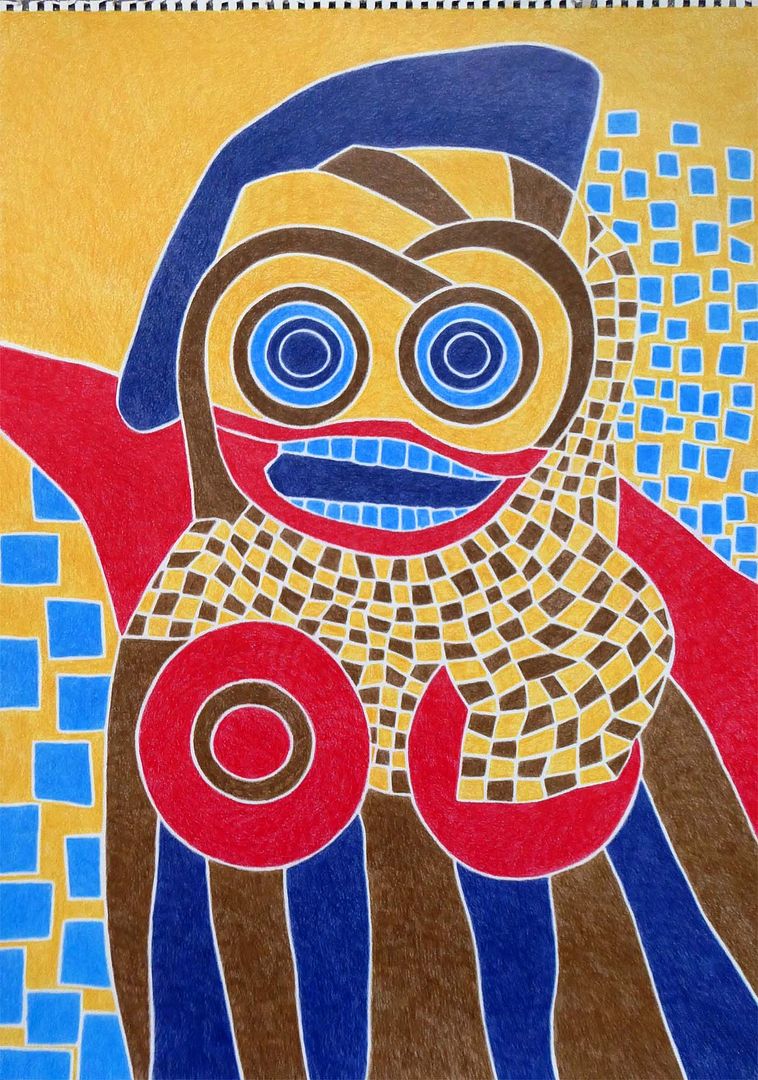 Miriam had een paar foto's gemaakt en toen we ze bekeken zei Silvia, 'maak mijn hoofd maar een beetje kleiner, mijn tanden wat witter en mijn ogen wat groter'. Dan wil ik wel een wat groter hoofd dacht ik en bij Joop frobelde ik wat haar erbij. We hebben vreselijk gelachen.
