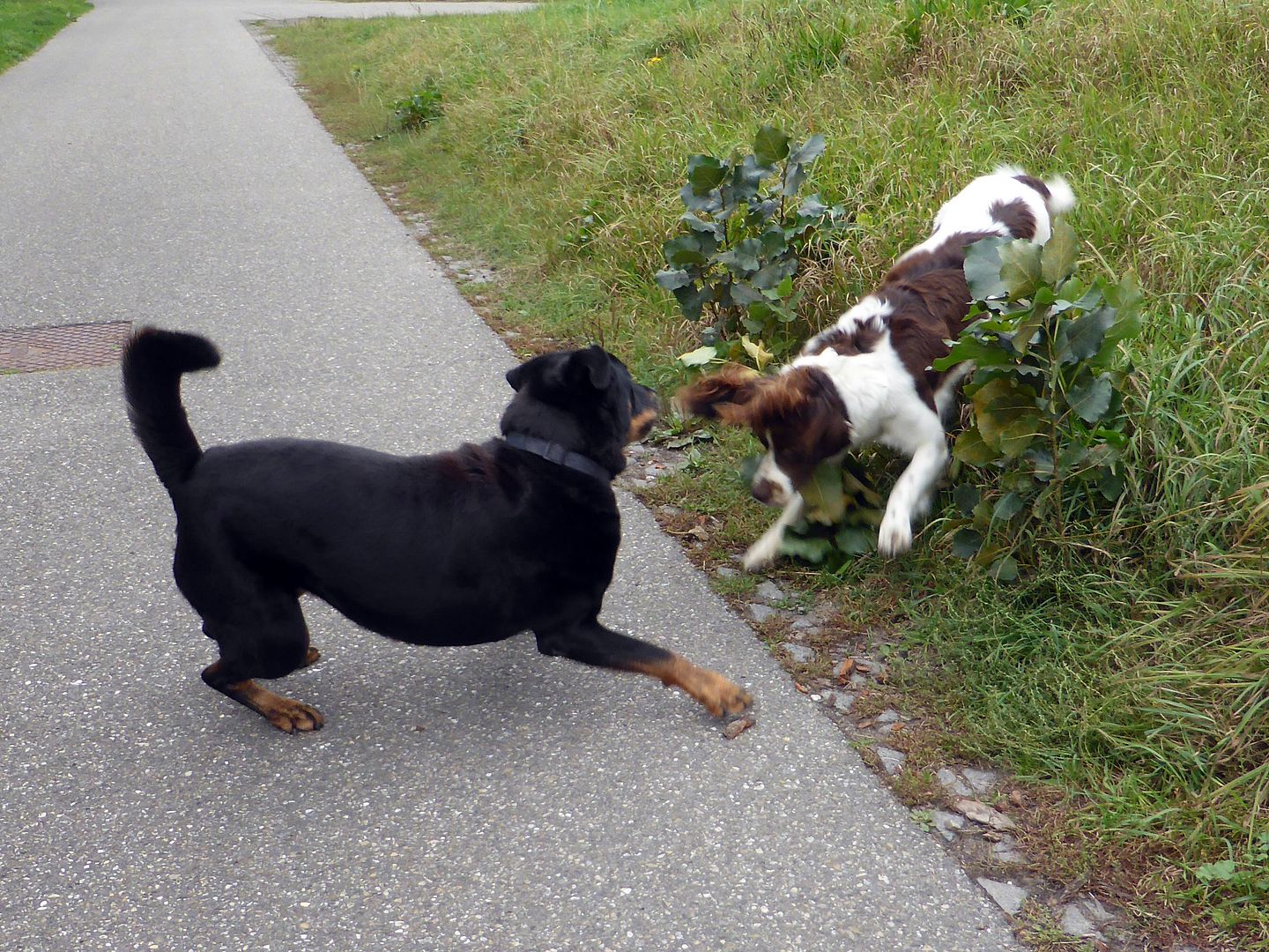 Vanmorgen liepen ze los, dus ik liet Didi ook haar gang gaan. Even snuffelen en ik mocht ze zelfs aaien en hun vrouwtje Didi ook, niets aan de hand. Een beetje aftasten, spelen was er nog niet bij, maar ze hadden de ruimte en zo hoort het! Dieren moeten ook de gelegenheid krijgen aan elkaar te wennen, daar schort het zo vaak aan!