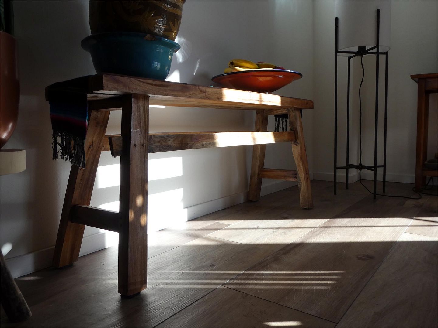 Het bankje dat wel behoorlijk grof is staat inmiddels bij de eethoek, daar kan ik nog wel een plant op kwijt, het staat gewoon gezellig daar. Het is allemaal wat, voorlopig vind ik het weer prima zo en ben ik blij dat de poef 'past' qua kleur en maat. Je kunt er ook prima gewoon op zitten.