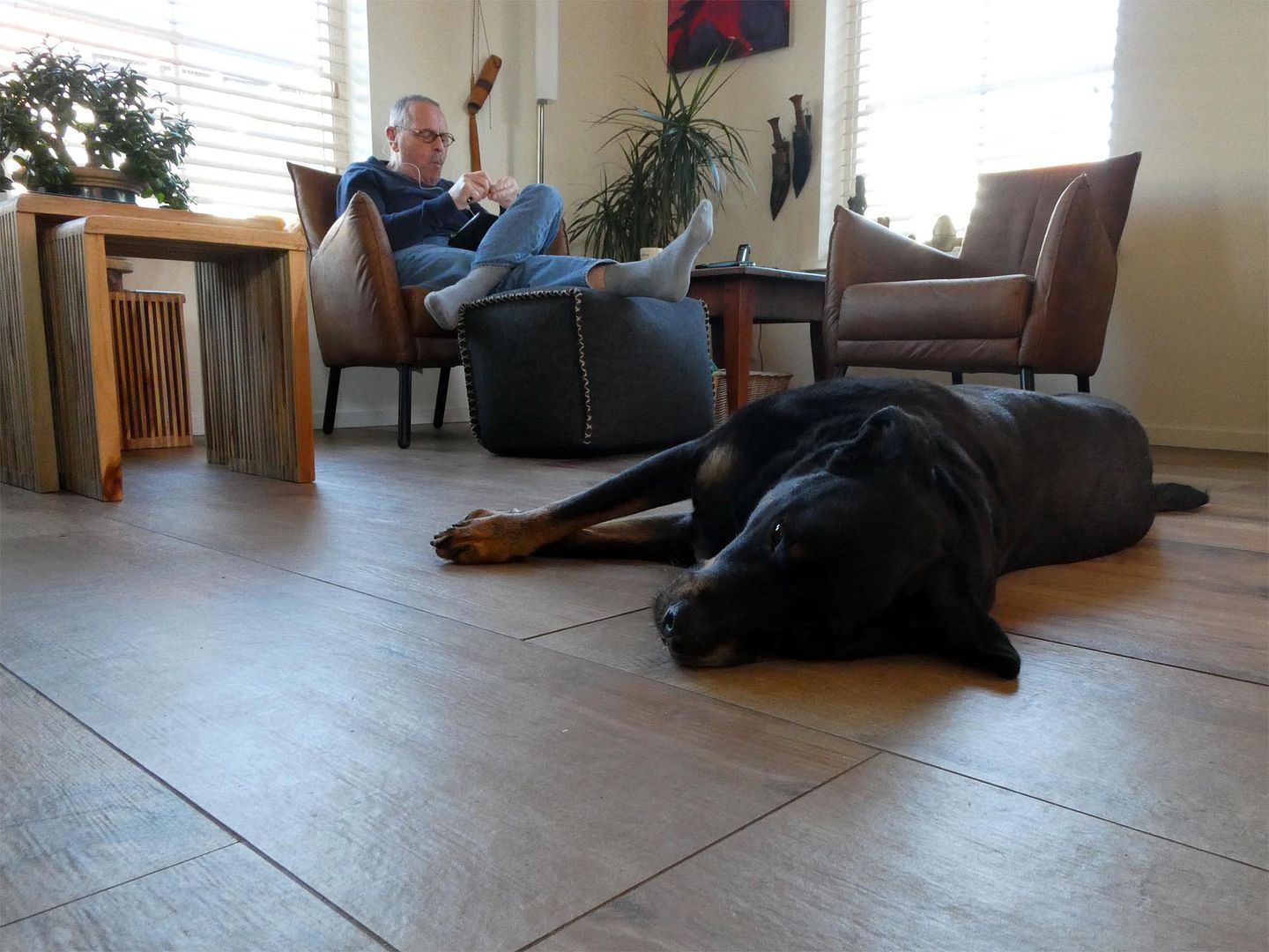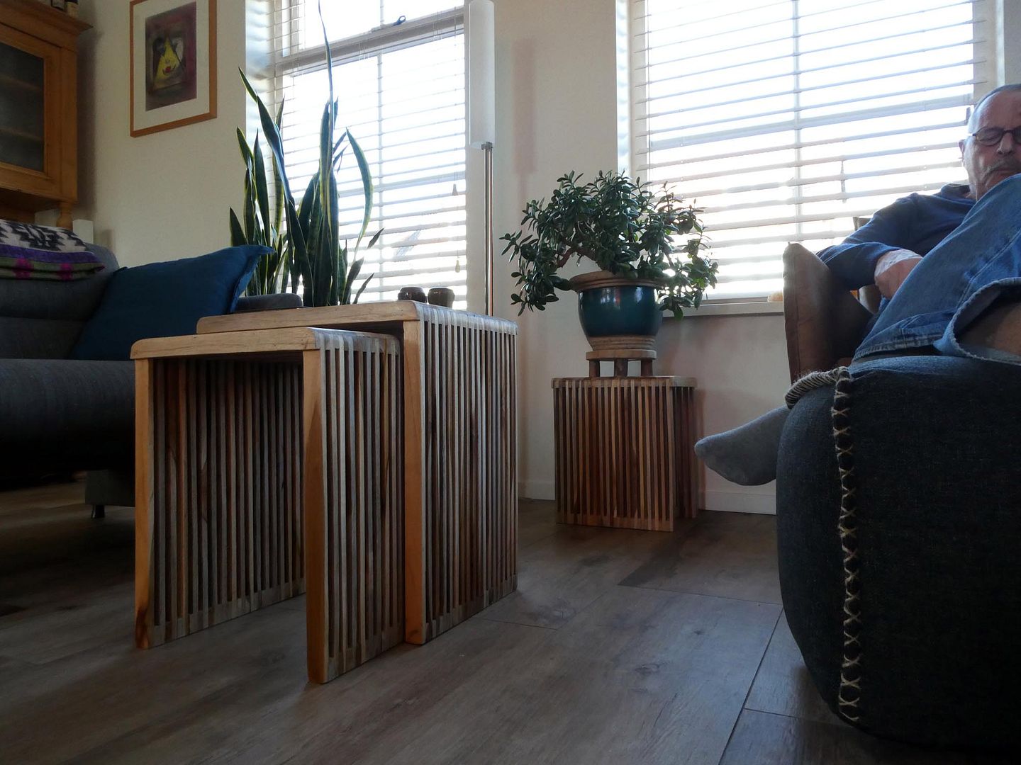 De bijzettafeltjes zijn gearriveerd en zijn leuk! Mooi afgewerkt en niet zo grof als het bankje, dat ik inmiddels alweer verzet heb omdat het niet goed bij de tafeltjes past, het werd veel te druk daar. Dat bankje staat nu bij de eethoek, heel leuk, daar kan ik wat planten op kwijt. Het is nu nog wachten op de poef, dat is ook best spannend want ik bestelde juist geen bruin omdat het dan allemaal te bruin werd. Misschien moet ik dan morgen Joop zijn stoel in de keuken zetten omdat de poef daar beter past.