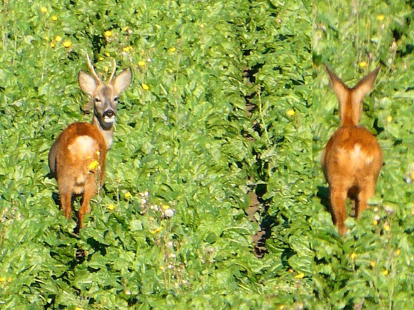 Het was weer een heerlijke dag. De reetjes liepen weer in de polder vanmorgen, deze twee zijn altijd samen, erg jong nog denk ik zo. Ik heb ze samen in één foto geplakt. De een is wat scherper dan de ander, ik moest flink inzoomen, maar toch een leuk gezicht dacht ik zo.