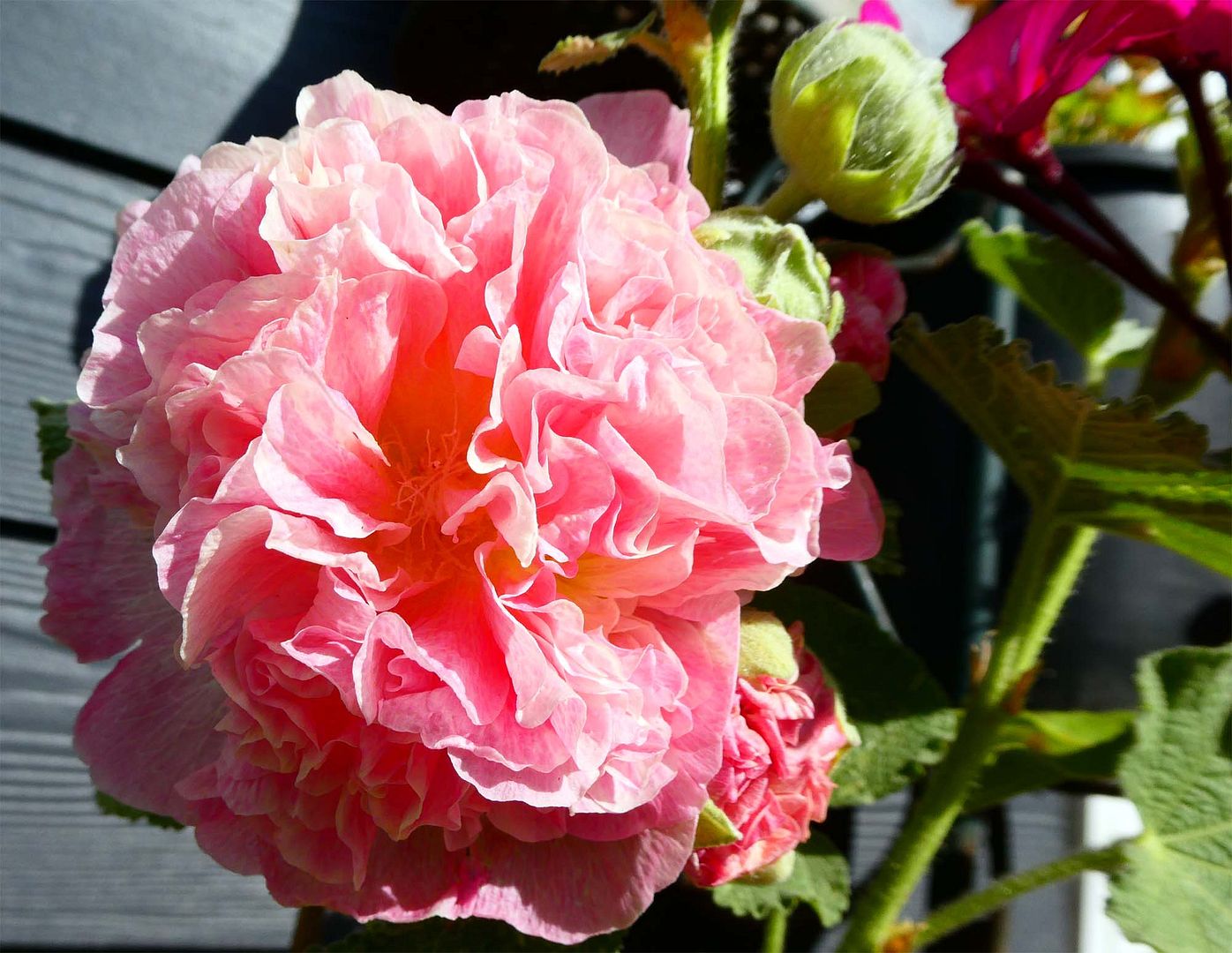 Wat heerlijk is het! De stokrozen beginnen gewoon nog met een nieuw stokje. Lekker om te wandelen ook want het is 's morgens nog niet warm en na de koffie rond een uur of twaalf gelijk nog een rondje waarbij Joop weer meeging.