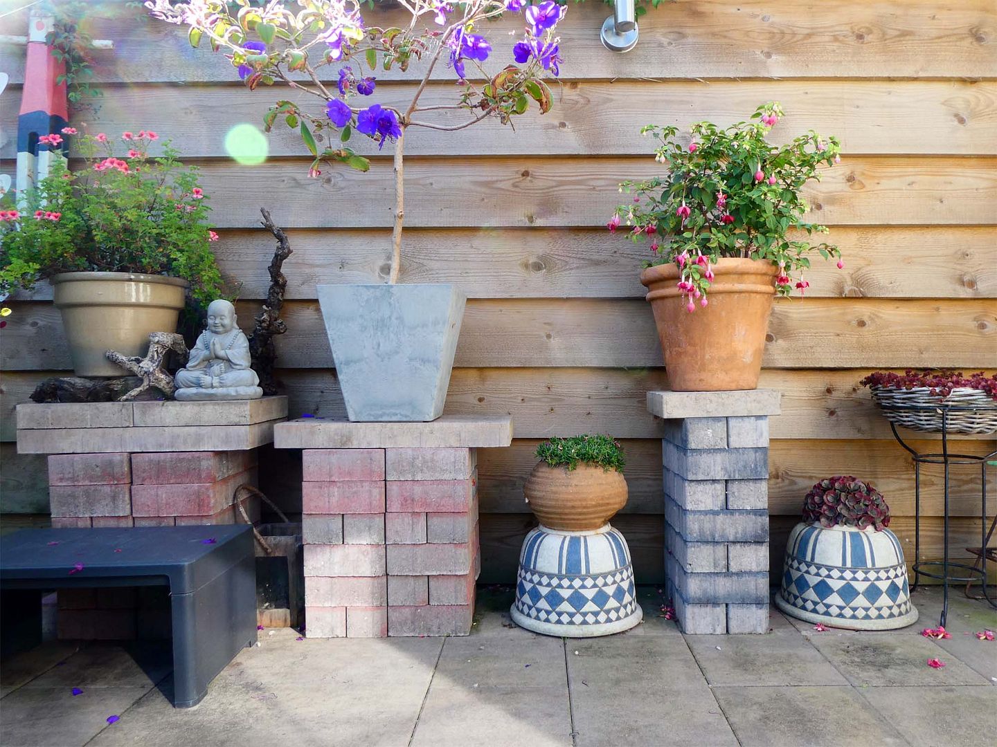 Nog even over de paal van gisteren, of eigenlijk meer het hoekje. Die pot stond daar al, dus die komt nu wat omhoog. Het plantje had ik eigenlijk gekocht voor in de bak, als Suzanne de moed had opgegeven... maar dat duurt dus nog wel even. Die kruiken daar zet ik af en toe eens iets in, ik weet het nog niet goed, als ik ze neerleg gaan ze rollen ze zijn zo niet erg decoratief vind ik. De grote zit al vol aarde vanwege de kunstbloemen met de Zonnemaire dag, die bleven anders niet staan. Er zitten ook al scheuren in, dus ja... en weggooien vind ik nog zonde.