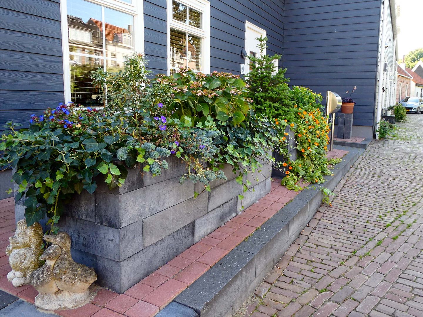 De bakken bloeien nog prachtig. De paarsblauwe vooraan vind ik ook altijd zo mooi en Suzanne kruipt helemaal over de stoep, ik laat haar nog maar lekker even haar gang gaan.