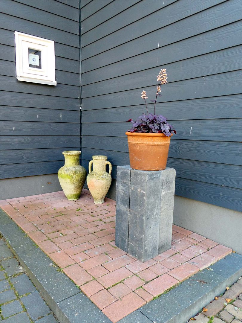Ik deed wat aan de vuulte op de stoep en trok eens aan de stenen die daar nog steeds lagen te wachten. Vier stuks die we gekocht hadden om op het 'gevaarlijke hoekje' te zetten, maar sinds het hoekje een stuk minder gevaarlijk is en de klimop er toch ook een beetje overheen groeit, besloten we om er een pilaar van te maken op het andere stukje stoep. Daar kan dan weer leuk een pot op. En als ik dan aan die stenen trek, weet ik dat Joop naar buiten komt om te kijken wat ik doe en hoe en waar en dan kan hij ze ook gelijk even optillen...