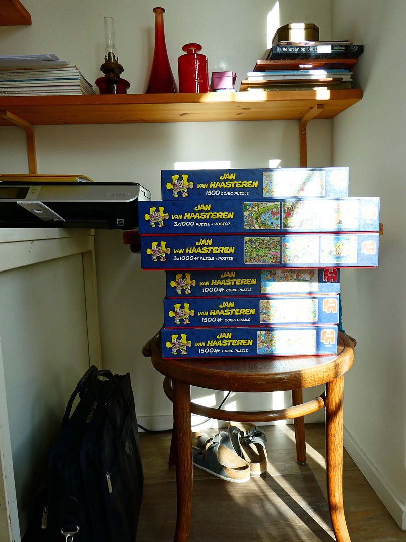 Deze van Jan van Haasteren zijn erg leuk, grappig en moeilijk ook best. Er is ook een levendige tweedehandshandel in. Nu wil het toeval dat wij een buurvrouw hebben die ook graag af en toe een puzzeltje legt, dus vandaag hebben ze er een paar geruild. Zij doet het al veel langer dus ze had er al verschillende uit de stapel van Joop gelegd.