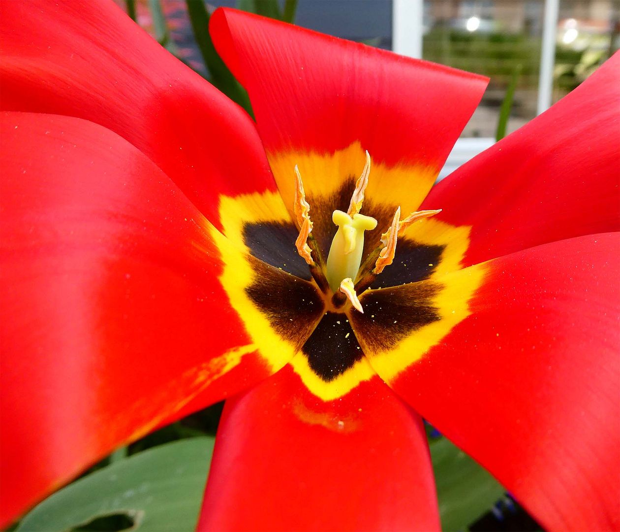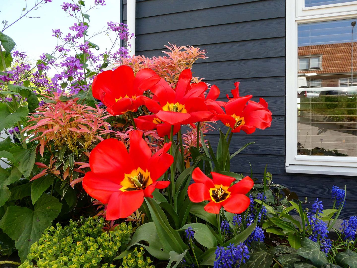 Al dagen loop ik te genieten van de prachtige, erg grote rode bosjes tulpen in de bakken.