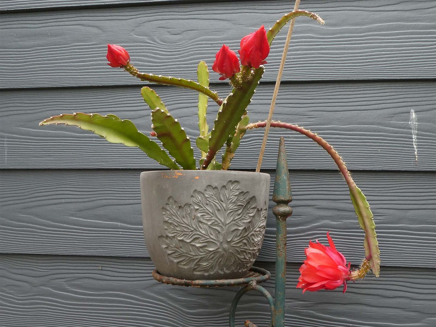 Kijk de cactusvanKees bloeit, vanmorgen was de knop open. Maar hoe onhandig wil je het hebben... zij staart zich blind op haar eigen potje.