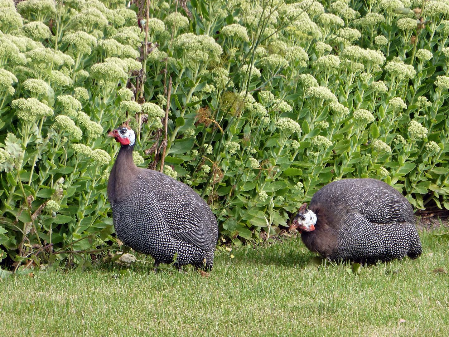 Je zult maar pas op een boerderij wonen, dan wil je toch een beetje beestenboel om je heen, zoals deze twee. Jonge kalkoenen misschien dacht ik, maar nee, het zijn parelhoenders. Ik vind ze wel mooi.