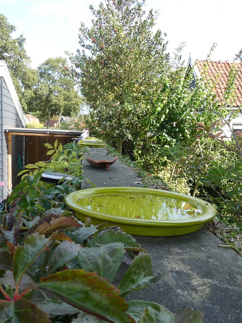 Daarna knipte ik de schutting tussen de achterbuurvrouw en ons, dat wil zeggen de bovenkant. Haar klimop wil naar mij toe en mijn klimplanten naar haar en dat hou ik een beetje in de hand. Hier kunnen we de winter weer wel mee door. Er staan drie van zulke schalen voor de vogeltjes die daar regelmatig dankbaar gebruik van maken.