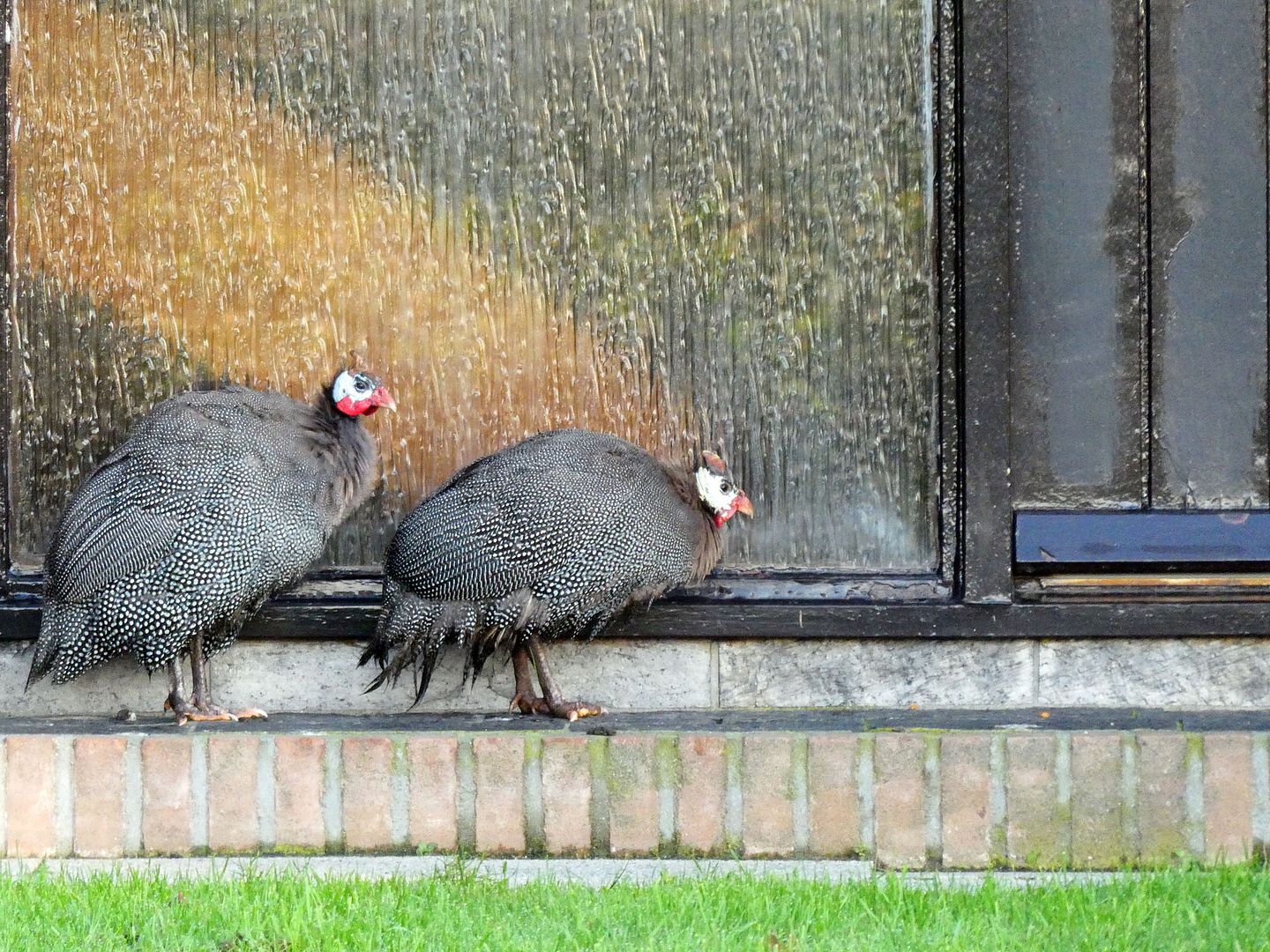 Daar waren ze weer vanmorgen! Ik had ze al een tijdje niet gezien maar ze zaten nu bij de buurman op de stoep, mooie parelhoenders, aparte beesten.