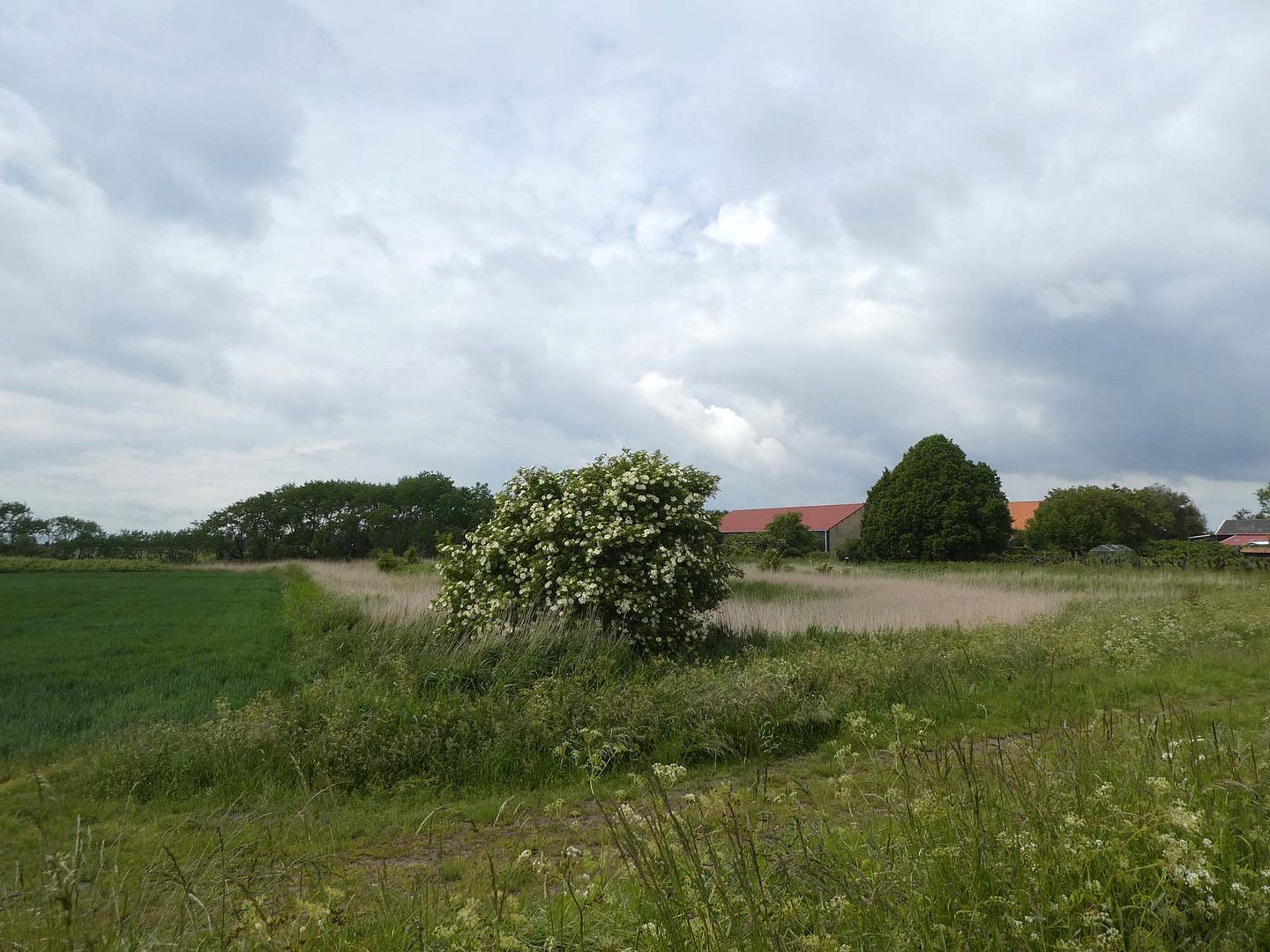 Het was al zo lekker vanmorgen dat ik besloot om door te lopen en te kijken of het vlas al bloeide. Dat nog net niet, maar ik denk dat het morgen best al een beetje blauw is, toch in elk geval al wat bloemen. Dat wordt weer vroeg uit bed!