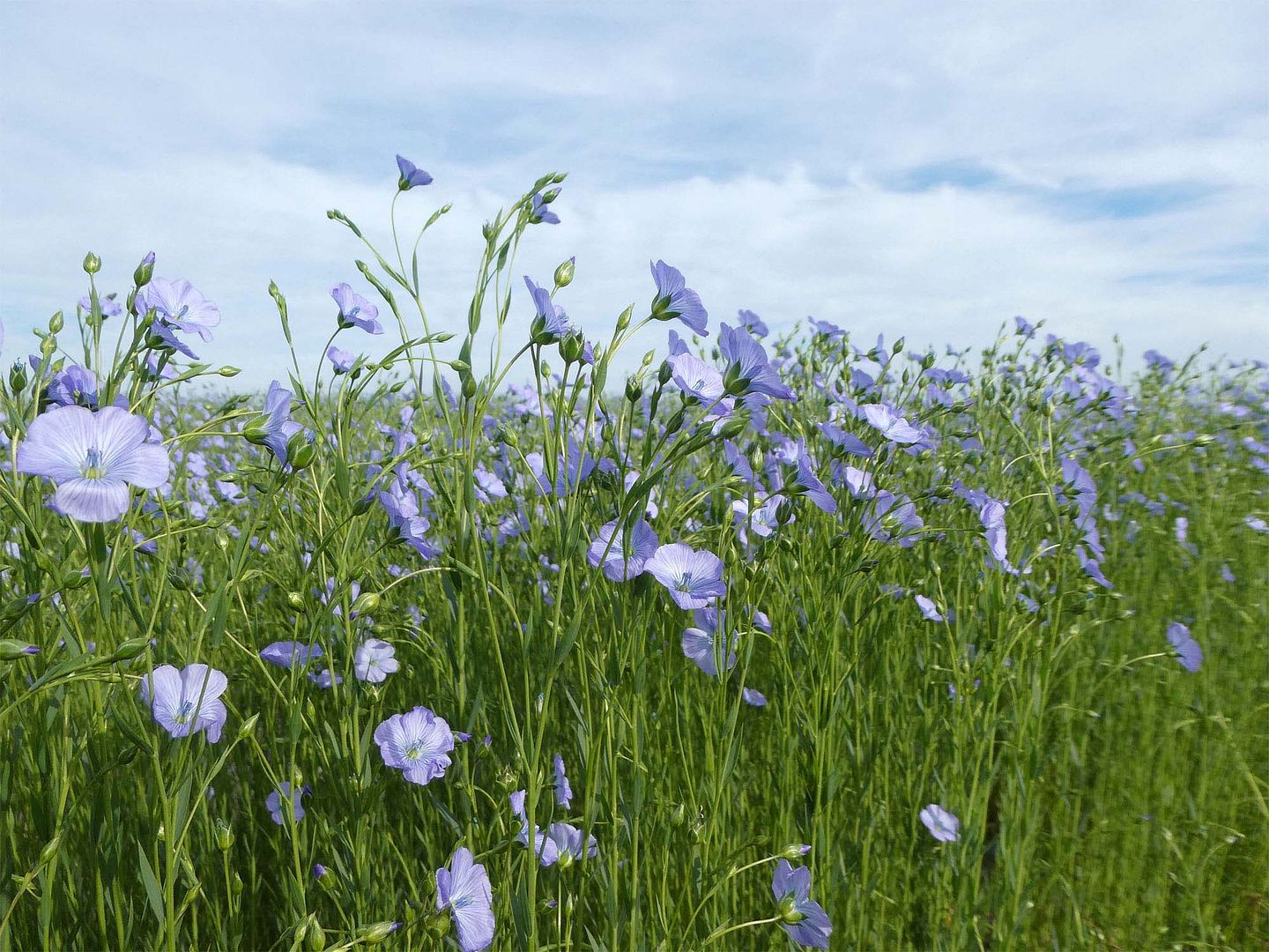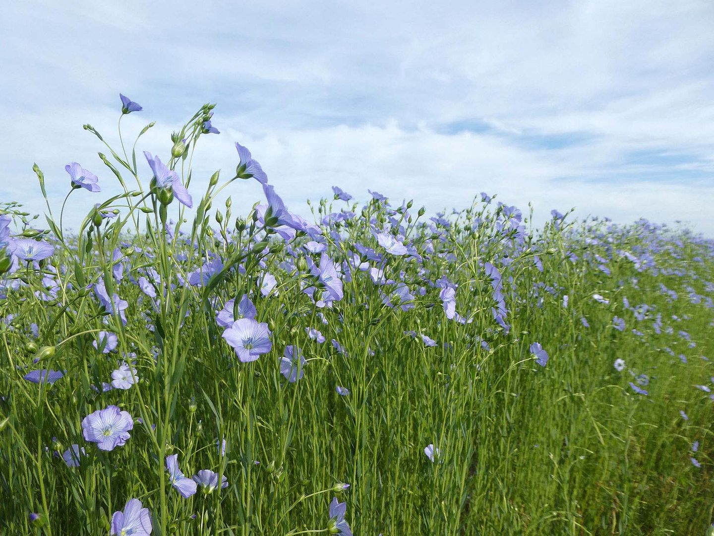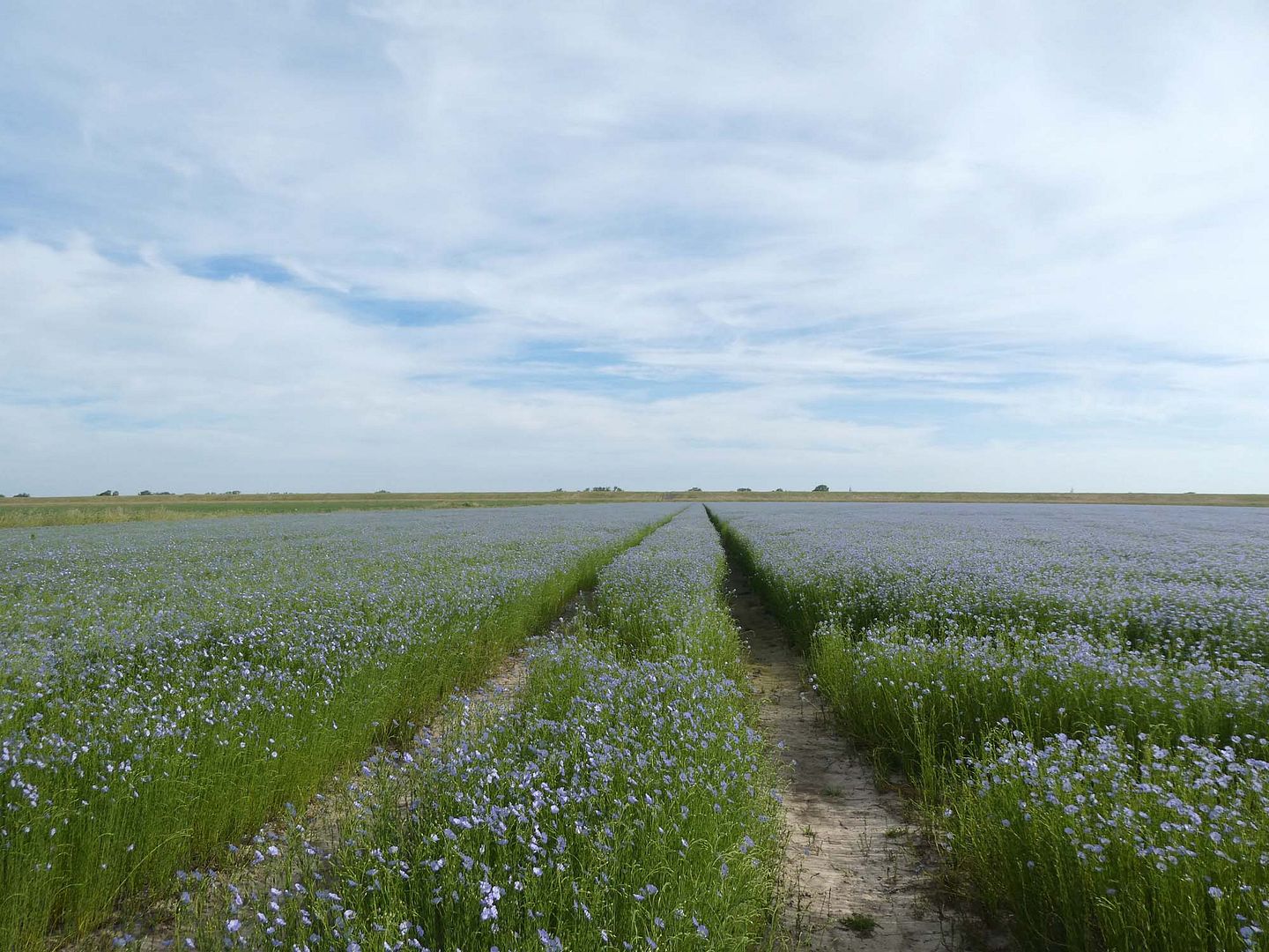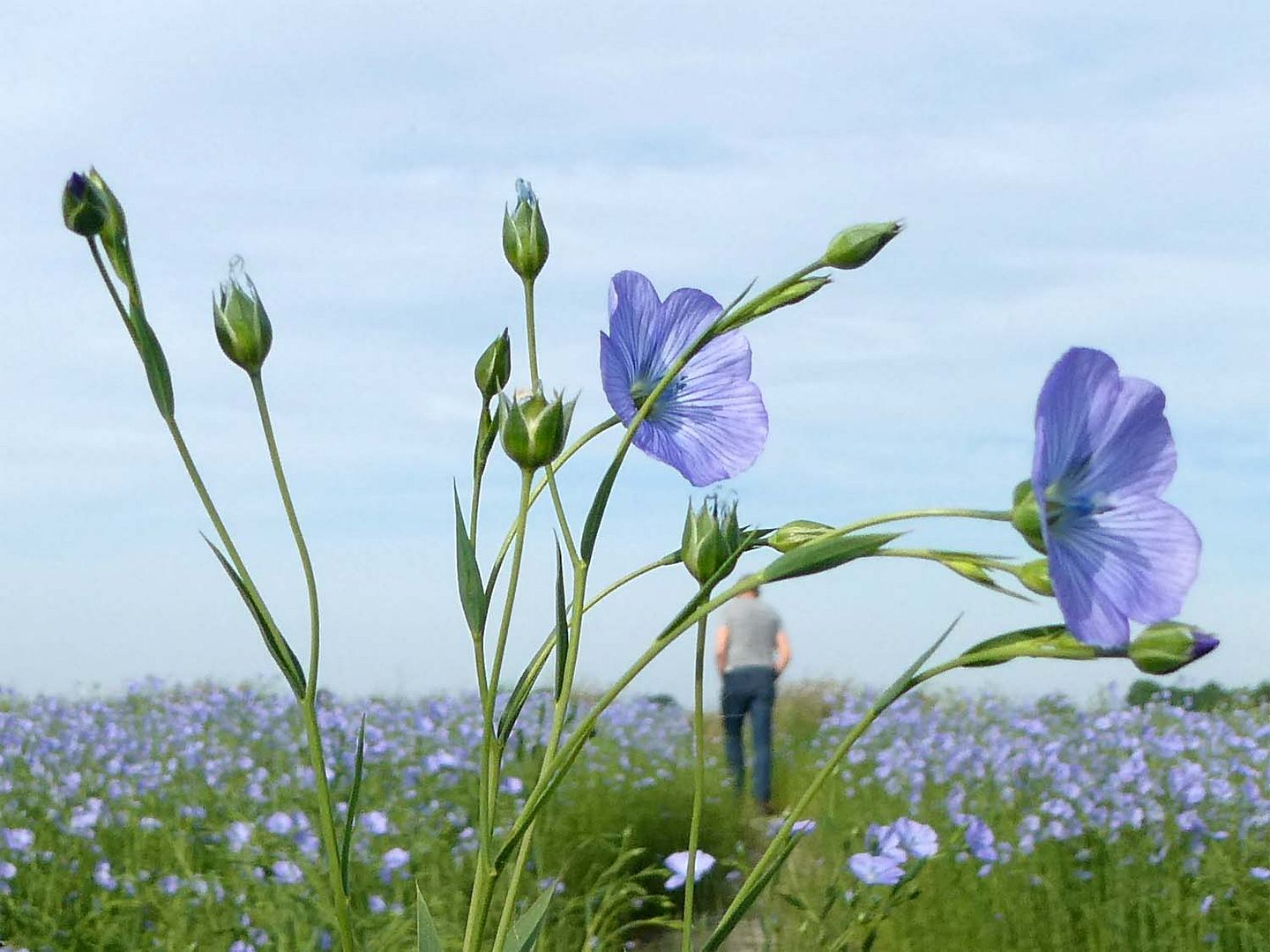 Het vlas ligt behoorlijk plat na alle regen van de afgelopen dagen, maar vlas is veerkrachtig, dat kan wel een keer of drie plat regenen voordat het niet meer overeind komt. We zullen het zien. Vanmiddag kwam de zon weer tevoorschijn, want het moet wel eerst opdrogen dan denk ik.
