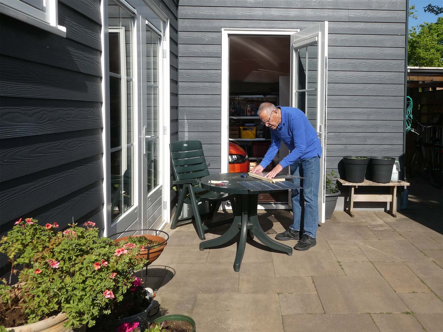 'Ampersant' veegde ik de rest van de tuin en sjouwde wat met stoelen en potten. Dat vegen was nodig want de boom heeft gebloeid en dat valt daarna allemaal naar beneden, het ligt een beetje aan de wind waar het dan terecht komt. Hierna komen ook nog pluizen geloof ik en dan in de herfst de helicoptertjes, verder geeft hij heerlijke schaduw.