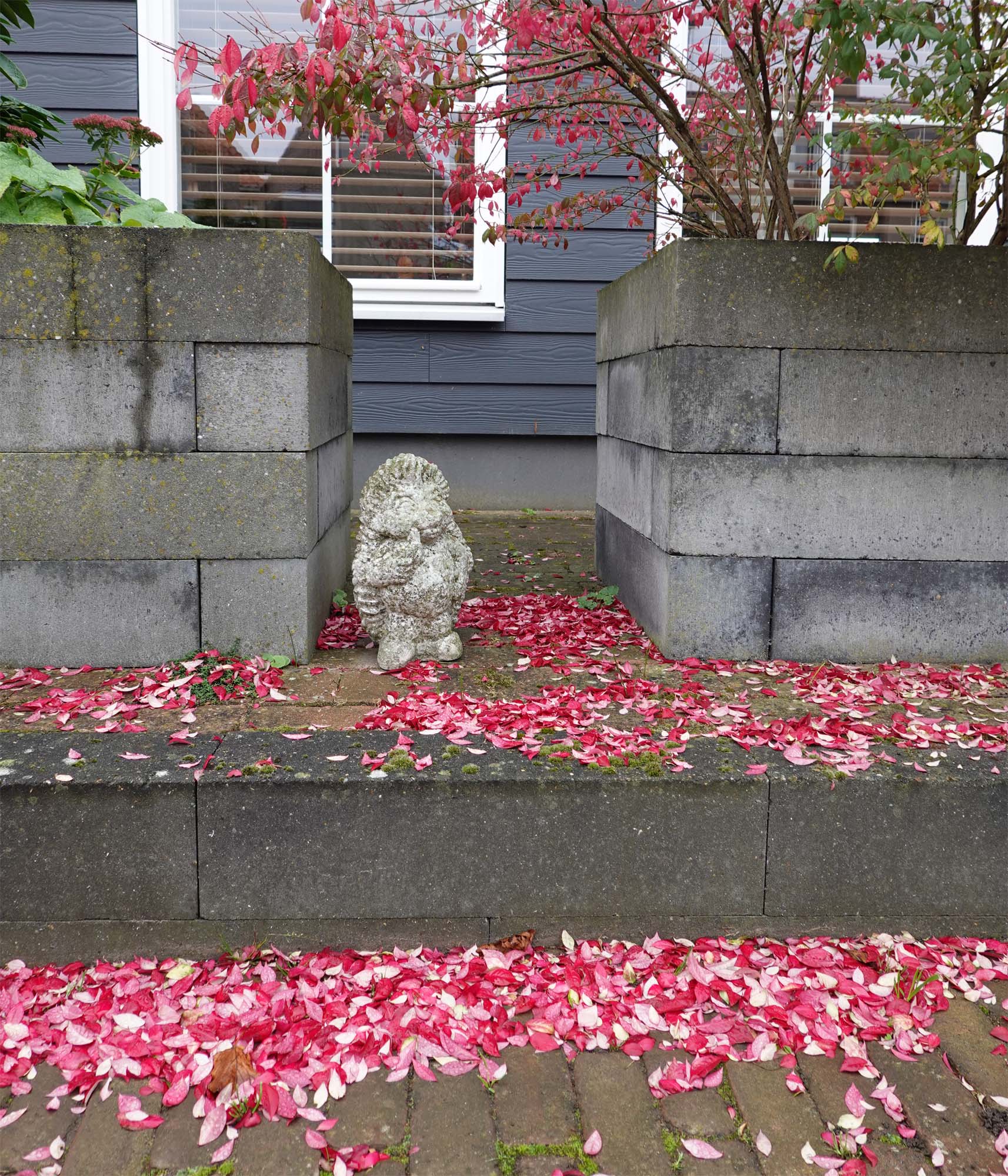 Het is toch maar een fleurig tafereel op de stoep, na het prachtige rood van de kardinaalsmuts nu de gevallen blaadjes die netjes blijven liggen omdat er geen zuchtje wind is. Erg mooi!