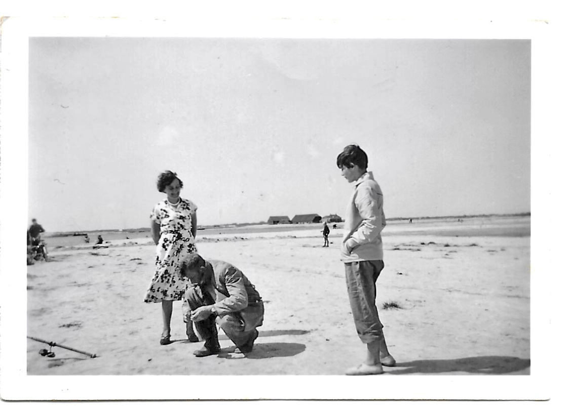 De foto is gemaakt op het toenmalige strandje bij Serooskerke waar opa en omoe woonden en waar we elke zomer een weekje gingen logeren, op de fiets, zo blij altijd als we er weer waren want dat was zeker een kilometer of tien. Pa en moe, hier veertigers en pa was lekker aan het vissen.