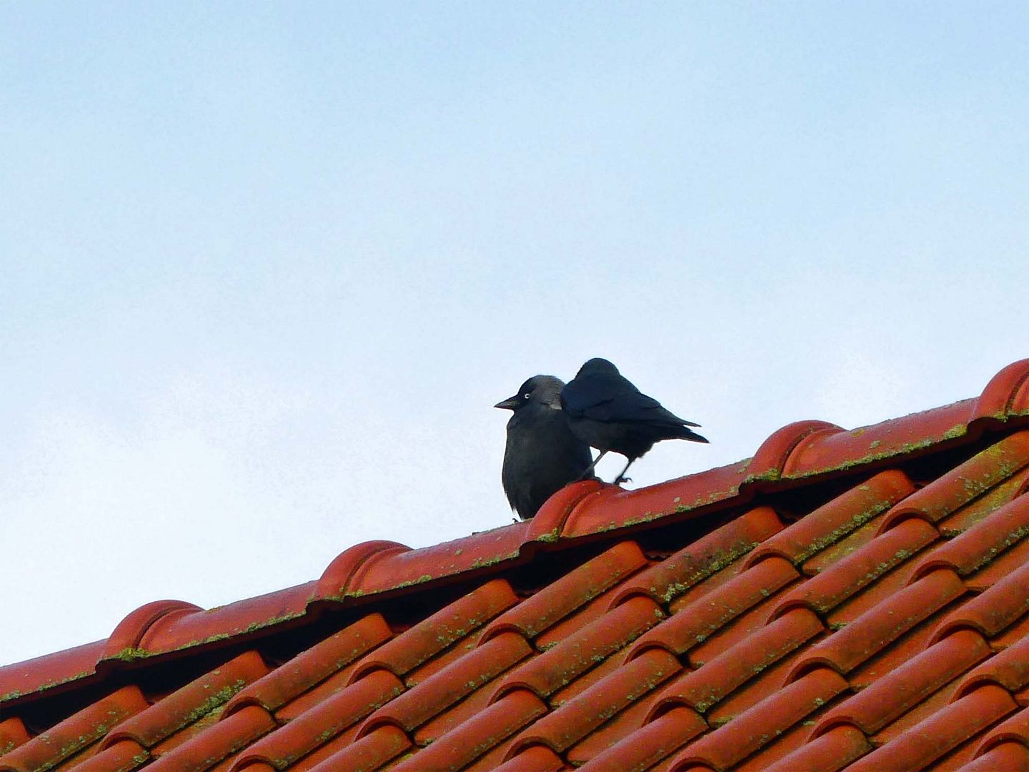 Er zat eigenlijk nog een stelletje naast, maar die vlogen op net voor ik de foto maakte. Ze zijn altijd zo leuk samen die kauwtjes.