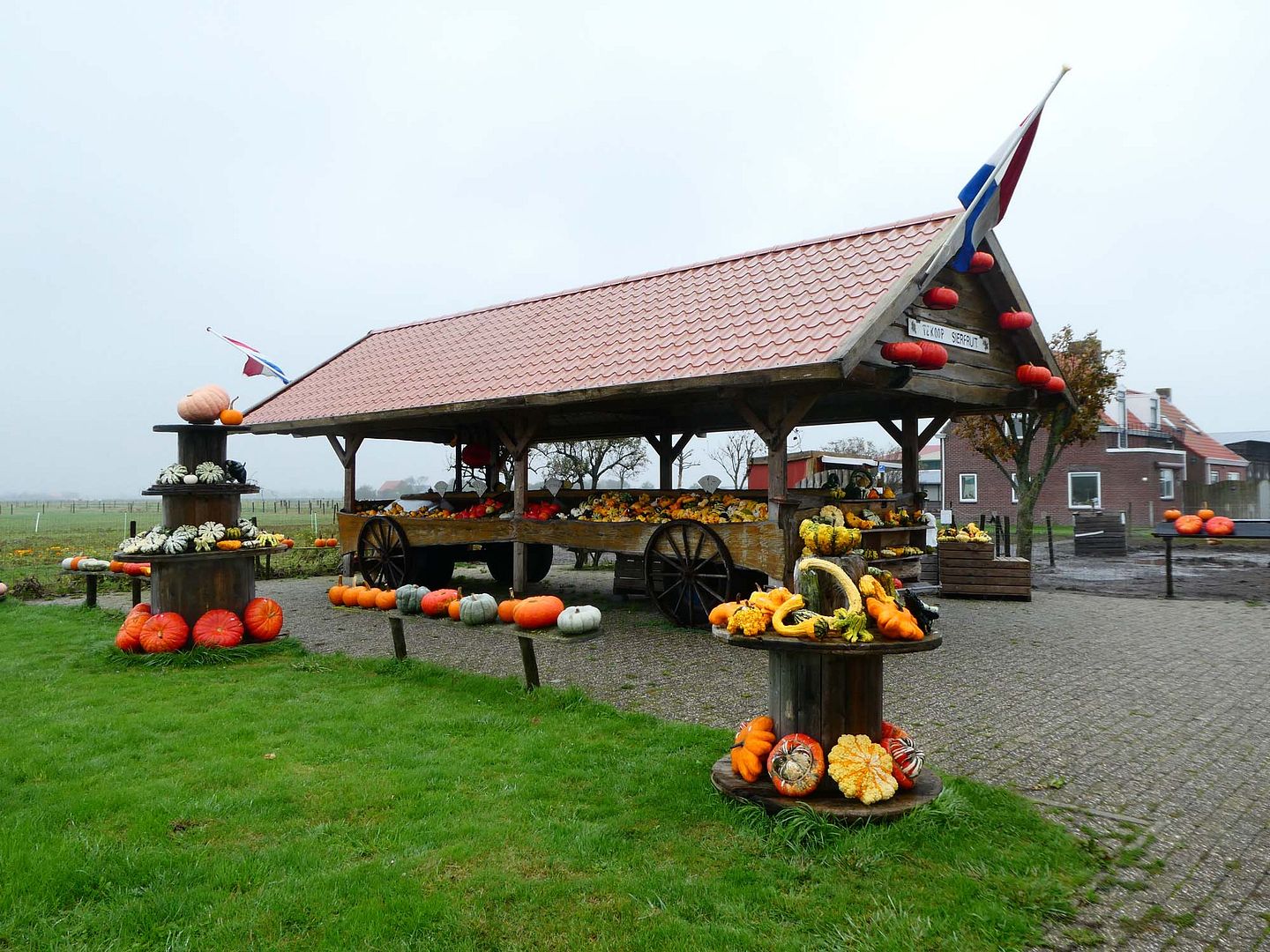 Vanmorgen scheen de zon nog even, maar daarna begon het gemiezer alweer. Ik bedacht dat ik weleens een pompoen uit kon gaan hollen, dat heb ik nog nooit gedaan, dus dat wordt een keer tijd.