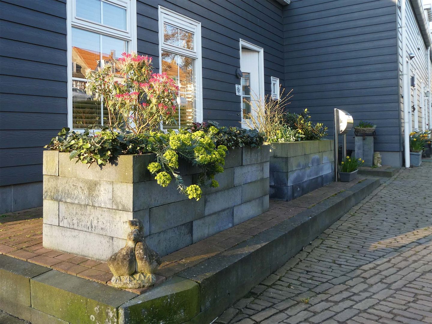 Eerst vanmorgen maar eens een foto van de bloembakken gemaakt, ze zien er al heel gezellig uit en alleen 's morgensvroeg staat de zon erop.