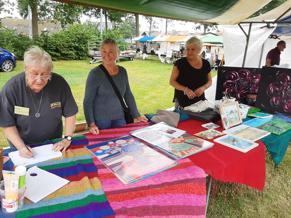 Ons kraam was van de Kleurdozen, een schilderclubje uit het dorp. Dat van mij is natuurlijk geen schilderwerk, ik kan ook merken dat mensen eerder kijken naar doeken of gewoon papier waarop iets geschilderd is, dan naar plastic hoezen waar wat in zit.