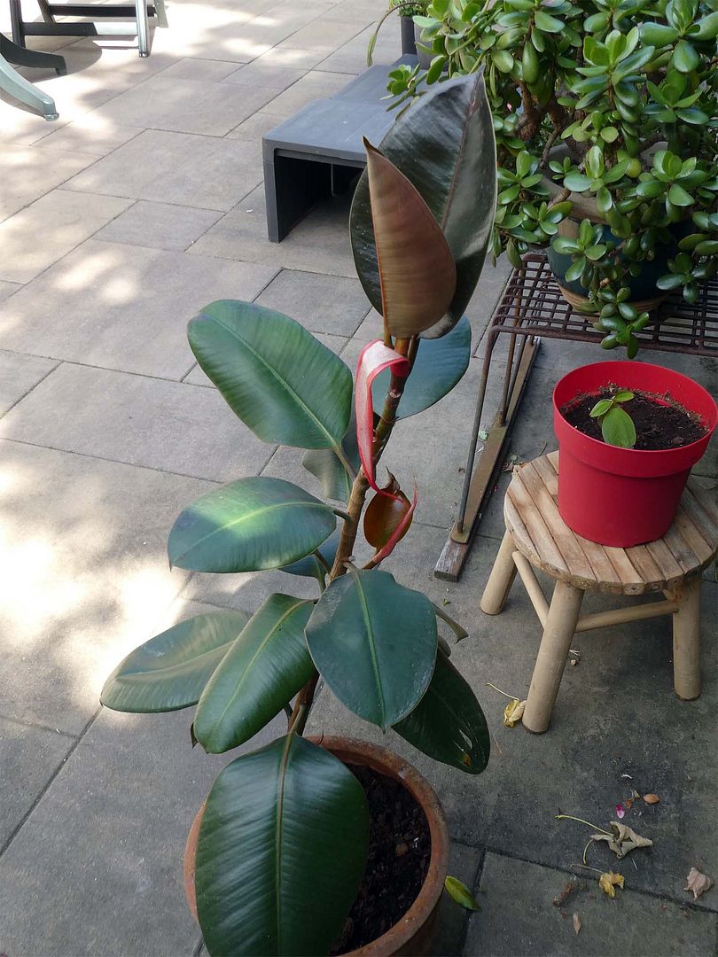 Je krijgt nog één kans zei ik, nadat ik al zijn armoedige, afgelopen winter geproduceerde blaadjes eraf had gesneden en zette hem buiten. Regen, hitte, aan alles heeft hij lak, er komen mooie nieuwe blaren en op de plek van de afgesnedenen? een nieuwe scheut, dat wordt een heel bos straks.