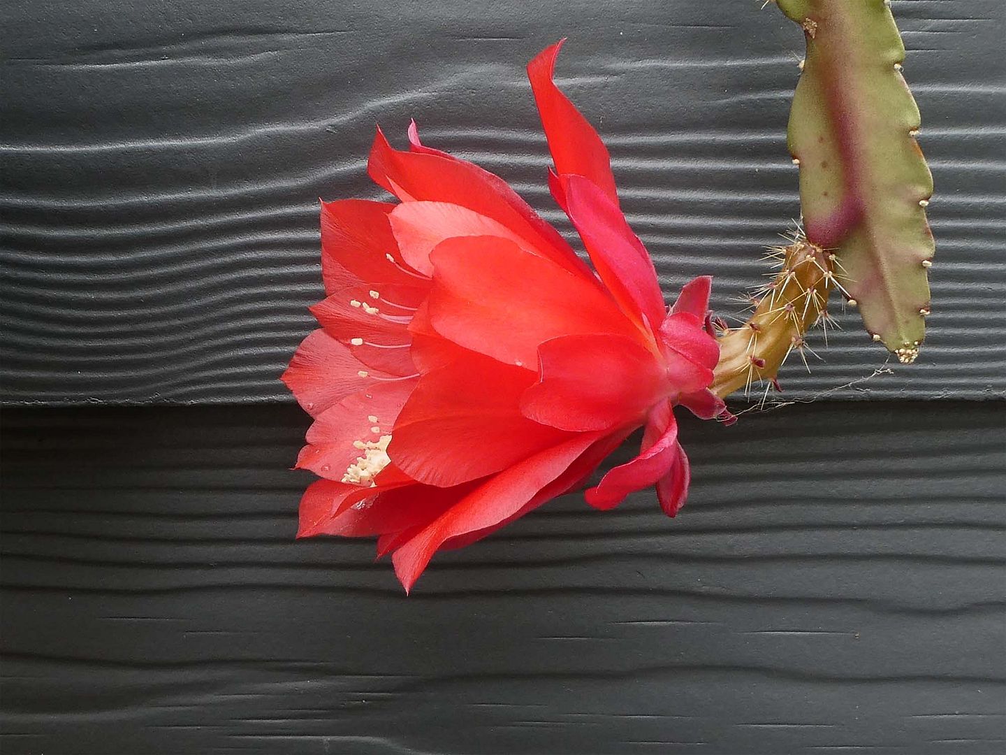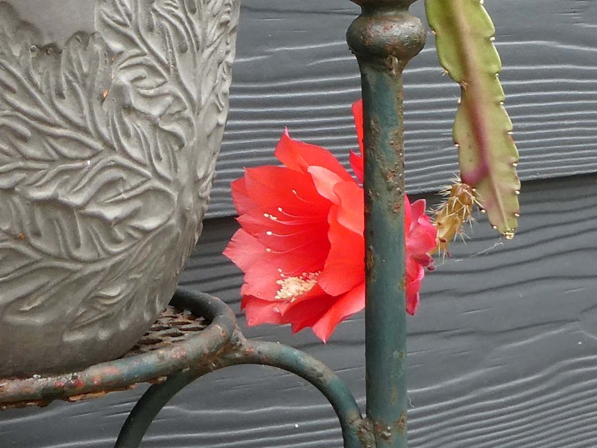 Kijk de cactusvanKees bloeit, vanmorgen was de knop open. Maar hoe onhandig wil je het hebben... zij staart zich blind op haar eigen potje.