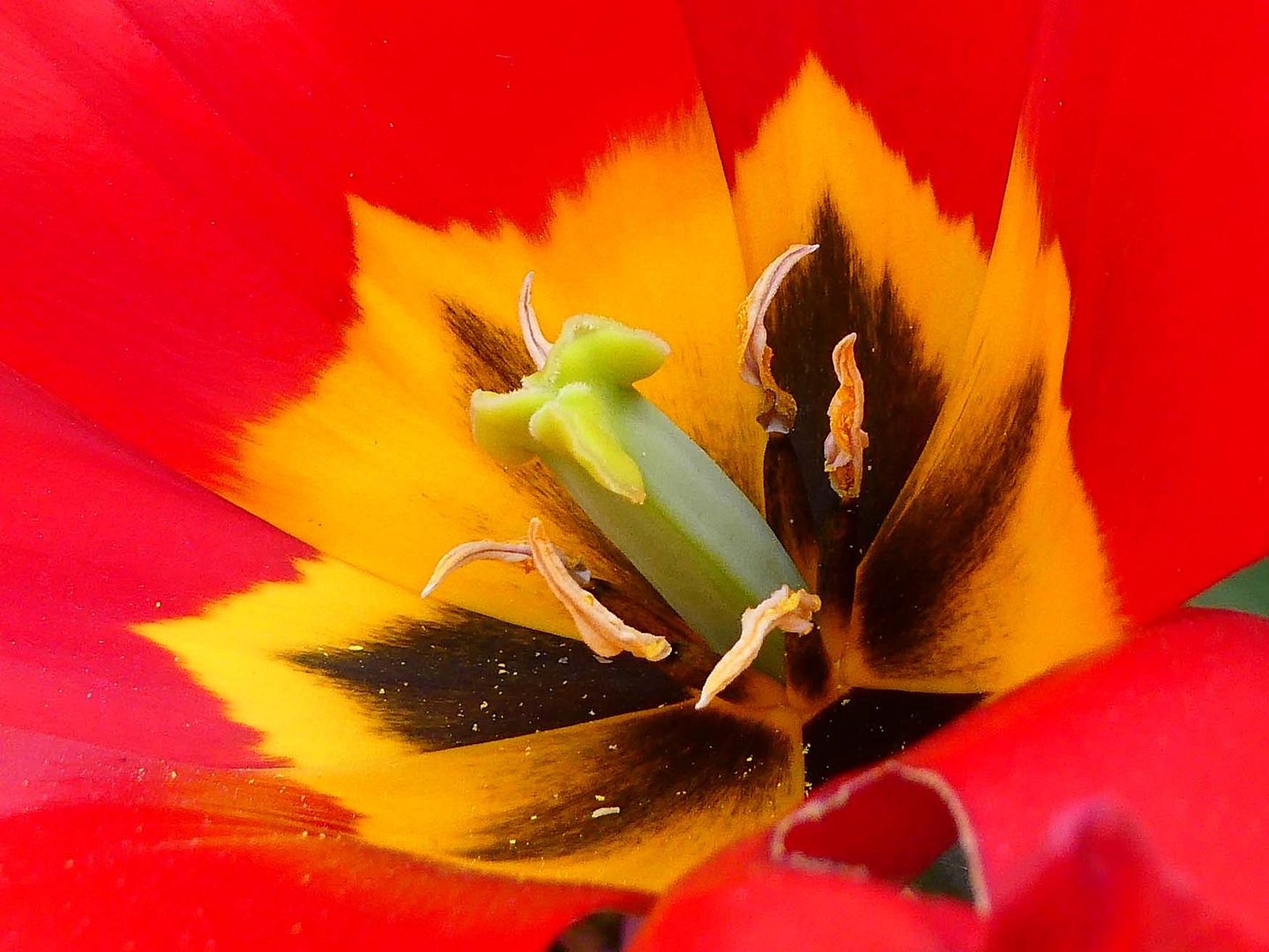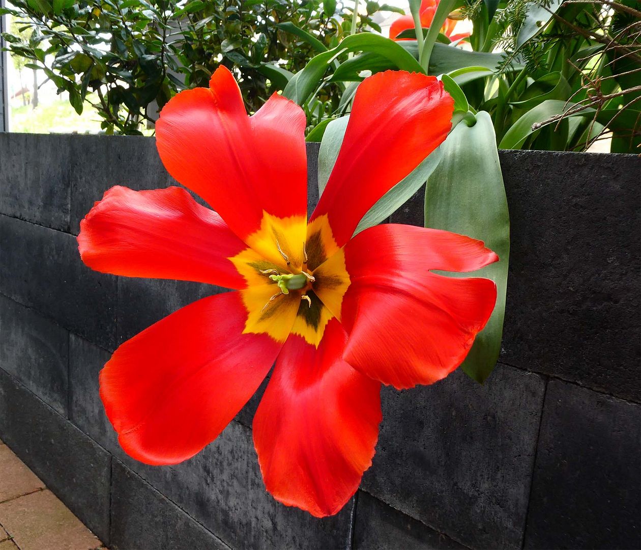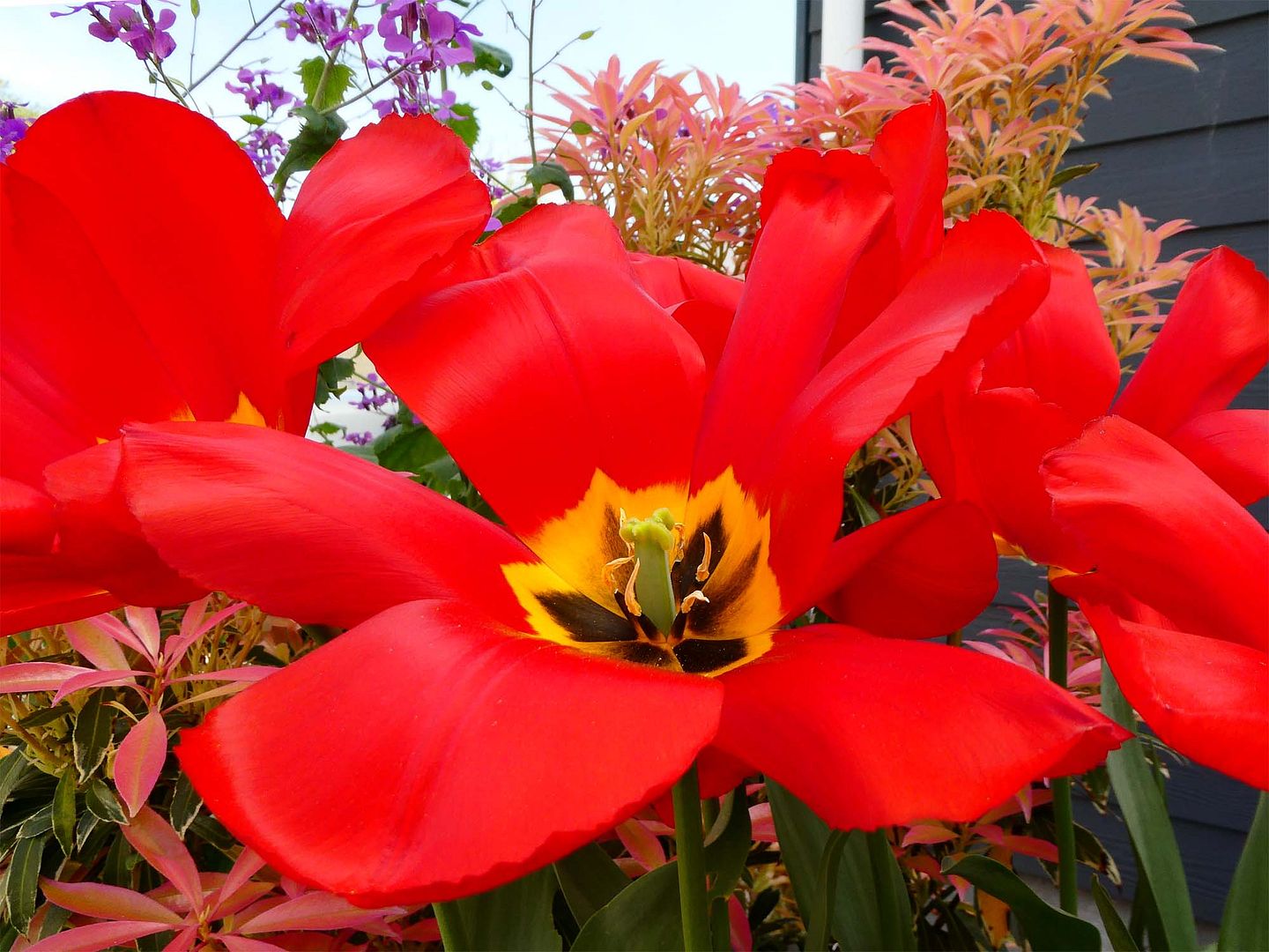 Al dagen loop ik te genieten van de prachtige, erg grote rode bosjes tulpen in de bakken.