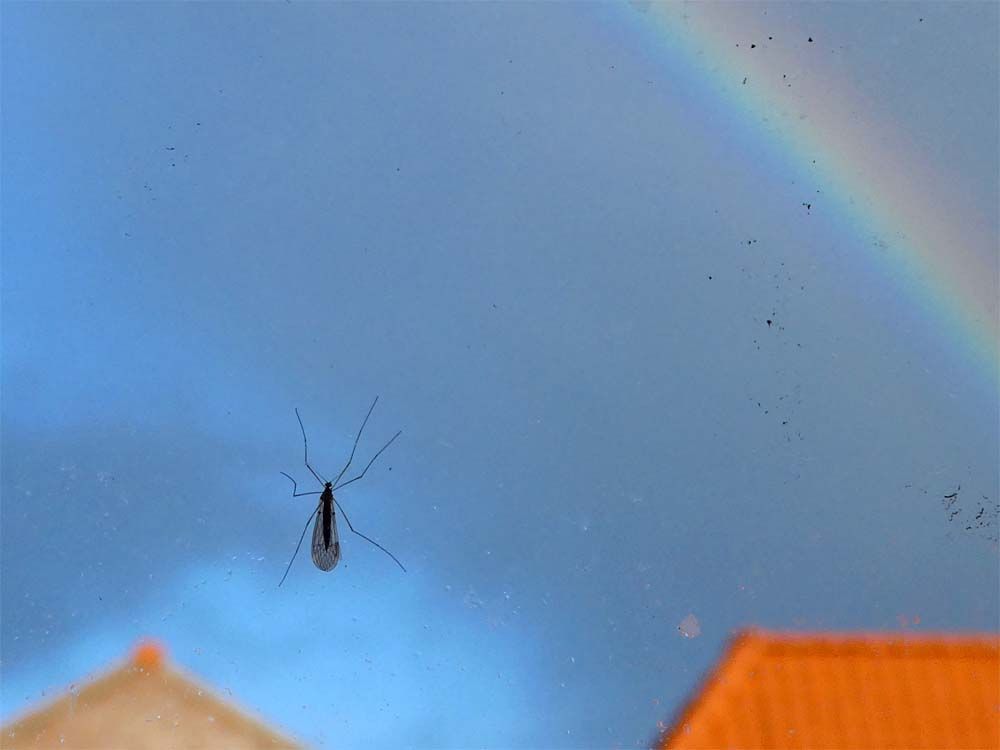 Foto's zijn van gisteren toen het weer nog eens wat verassingen voor ons in petto had, vandaag was het een grijze boel. En als je dan de regenboog wilt fotograferen is er best kans dat je toestel de mug veel belangrijker vindt.