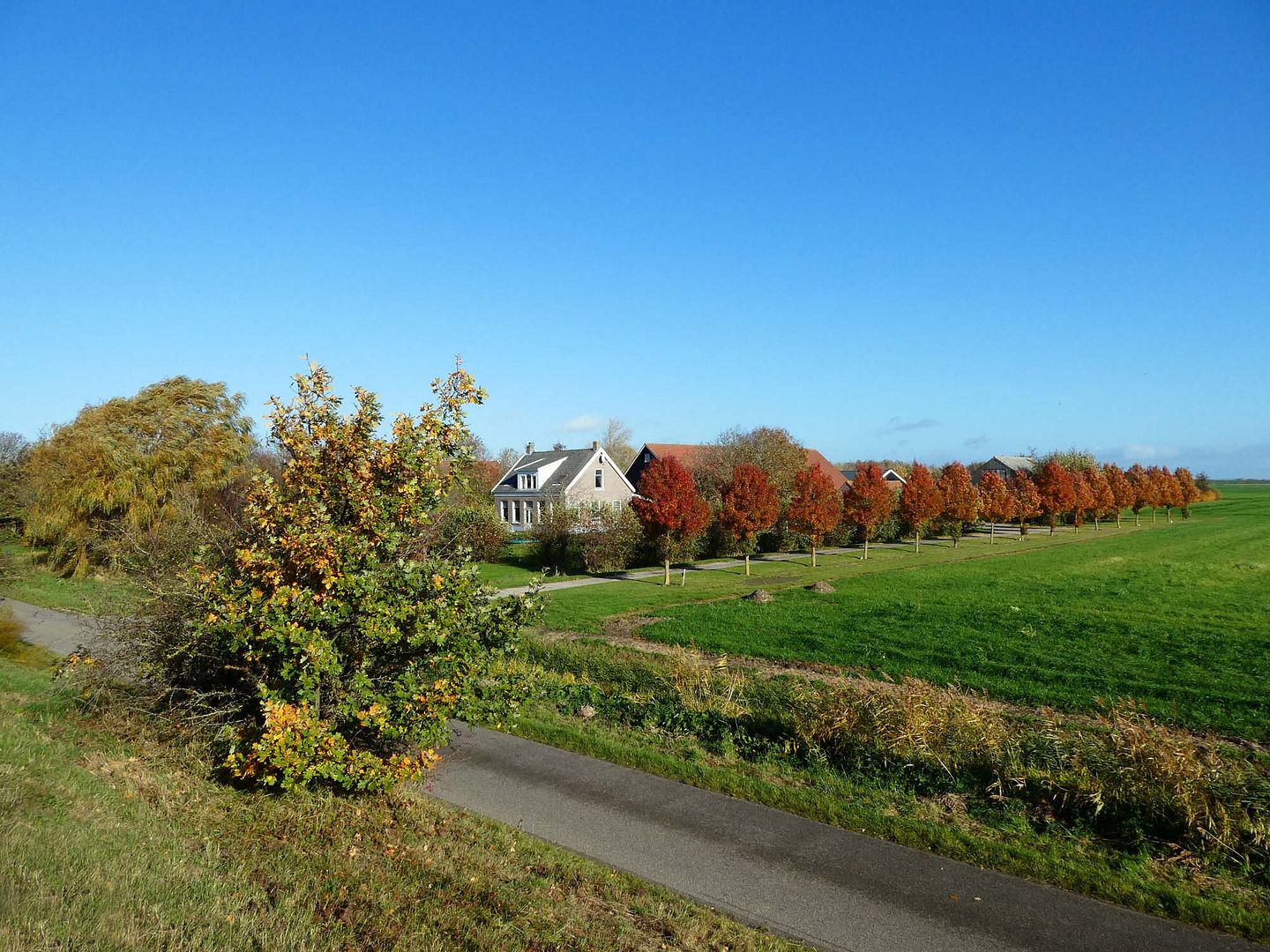Vanmiddag liep ik richting de Dijkhuisjes en ook daar is het herfst. (dit zijn niet de dijkhuisjes natuurlijk maar een boederij aan de andere kant van de dijk)