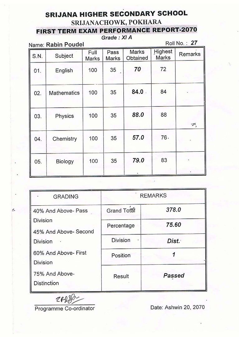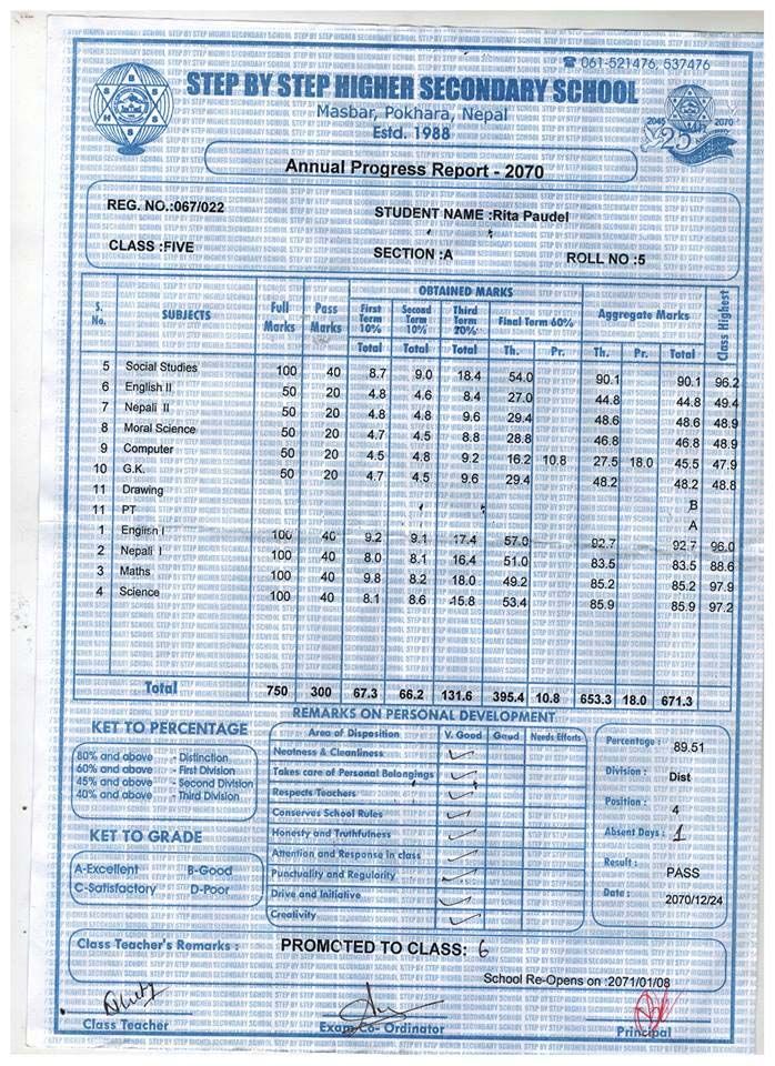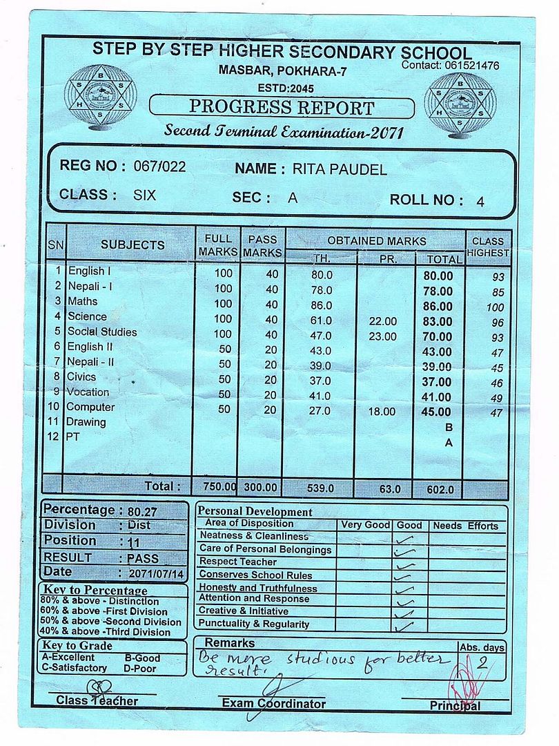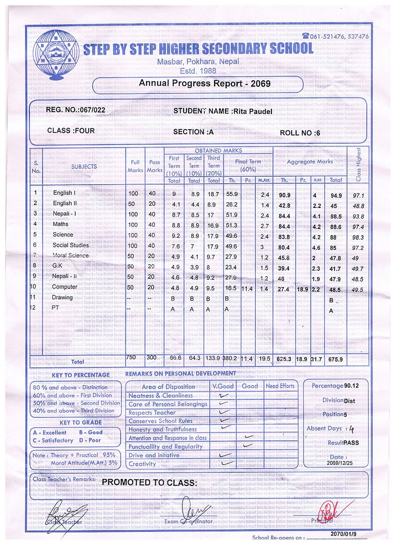 Bijgaande het overgangsrapport van Rita. Zoals jullie kunnen zien is het weer een uitstekend rapport met een gemiddelde van een 8,5. Beter dan ooit. Het gaat dus prima met broer en zus. Rabin is morgen jarig en wordt dan 19 jaar. Ook met hem gaat het goed op de universiteit in Kathmandu.