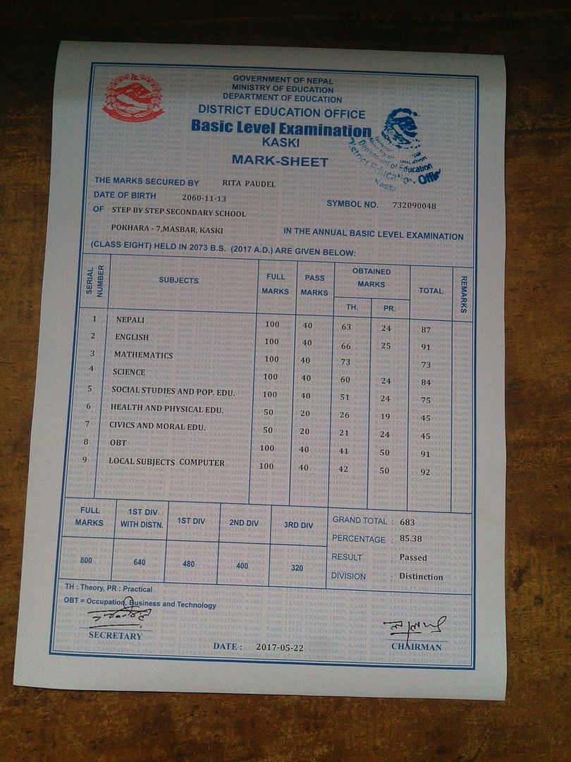 Toen ik terug kwam van de trekking was Rita ook weer in Pokhara. Ik heb ze toen uitgenodigd om wat te gaan eten in een restaurant dicht bij de Lodge. Ik heb met beiden goed kunnen praten over hoe het op school gaat en hun plannen en de thuis situatie. Leuke avond geweest. Rita had net wel een cijferlijst gekregen die ik hierbij toevoeg. Ook zij doet het goed op school. Zij zit nu in het 6de leerjaar van de 12 en is nu 11 jaar. Rabin is nu 17 jaar. Ik heb een foto toegevoegd van beiden met hun vader en een foto van elk afzonderlijk.