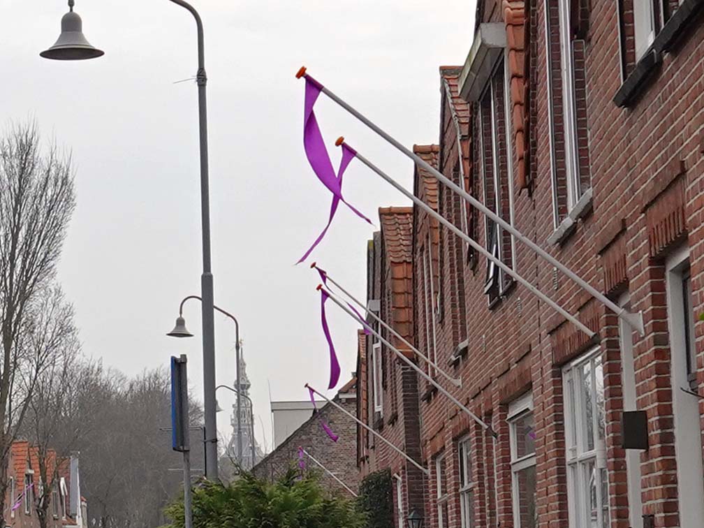 Paarse wimpels in de Weststraat vanmorgen. Ik had geen idee waar het voor was, dus eenmaal thuis zocht ik het eens op. Blijkbaar was het vorig jaar ook al gedaan wegens Wereldkankerdag en een zieke straatgenoot en gisteren dus weer wereldkankerdag. Iedereen wist dat vast behalve ik.