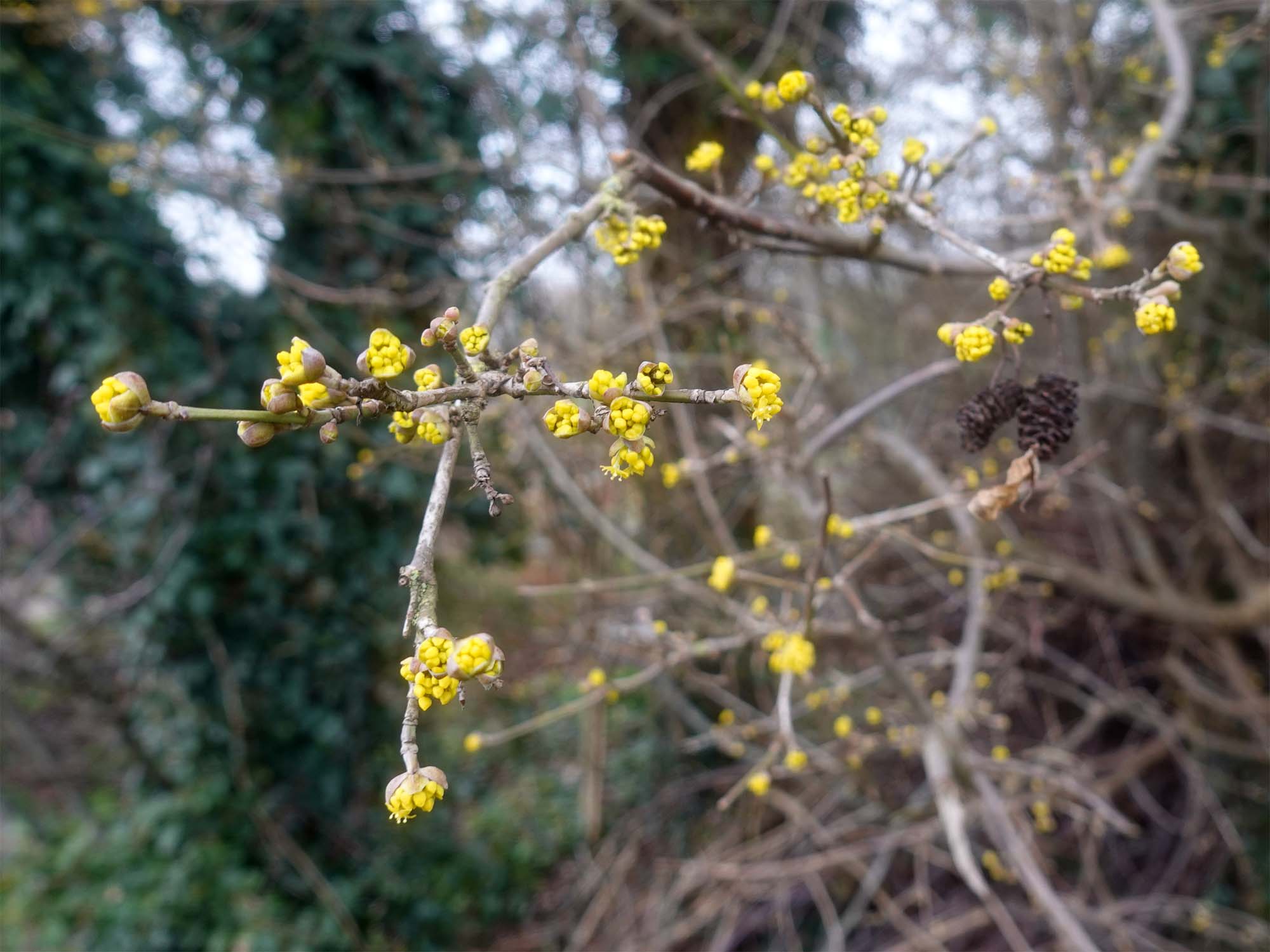 Er werd gesnoeid, er lagen takkenbossen naast het paadje en ik nam er een paar mee voor in de vaas, geen idee wat het is maar er zitten al knoppen in, forsytsia en ribes lijken uitgestorven.
